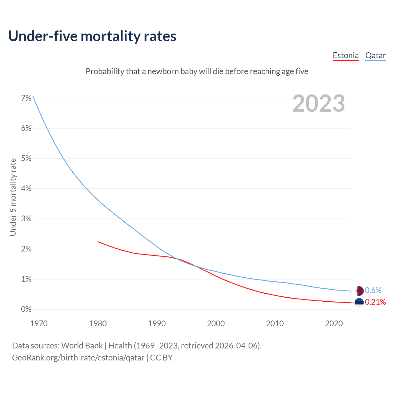The chance that a newborn baby will die before reaching age five is 0.21% in Estonia and 0.6% in Qatar. Above is a chart with historical data on under-five mortality rates.