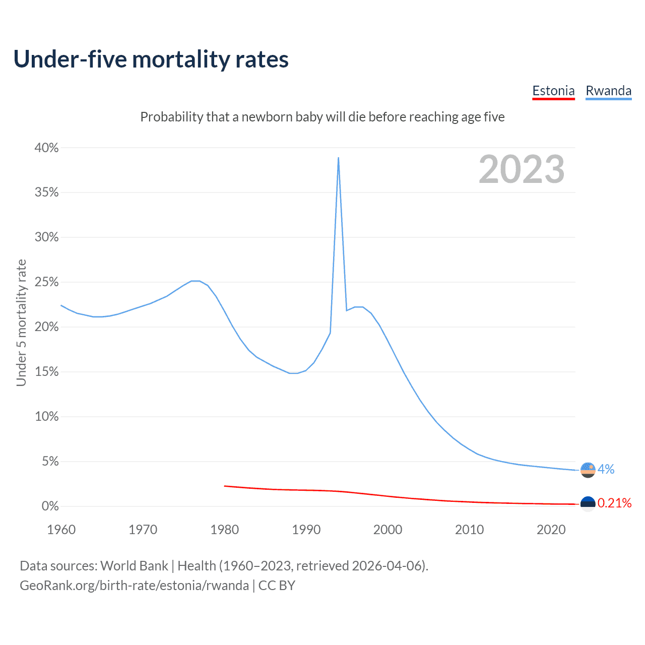 The chance that a newborn baby will die before reaching age five is 0.21% in Estonia and 4% in Rwanda. Above is a chart with historical data on under-five mortality rates.