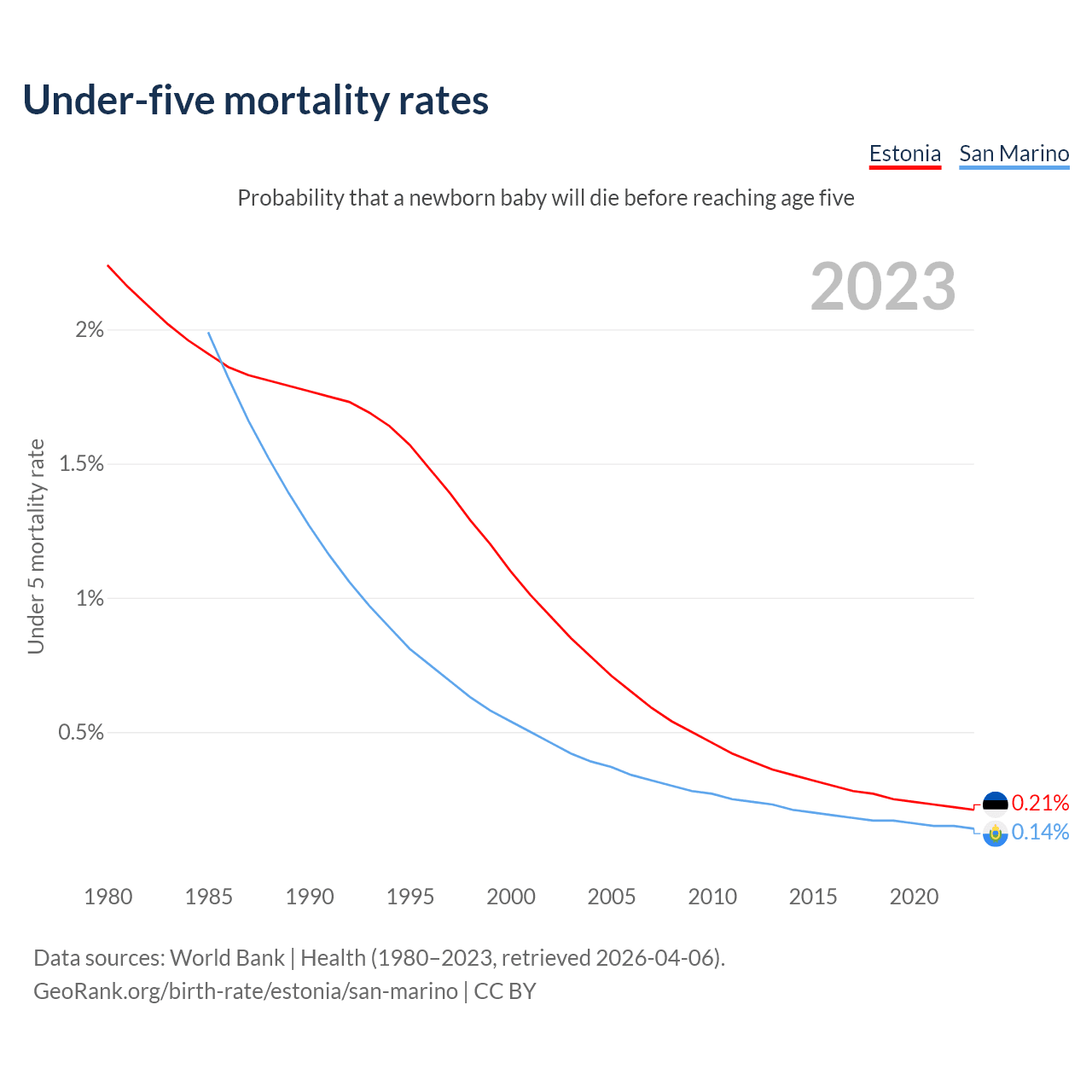 The chance that a newborn baby will die before reaching age five is 0.21% in Estonia and 0.14% in San Marino. Above is a chart with historical data on under-five mortality rates.