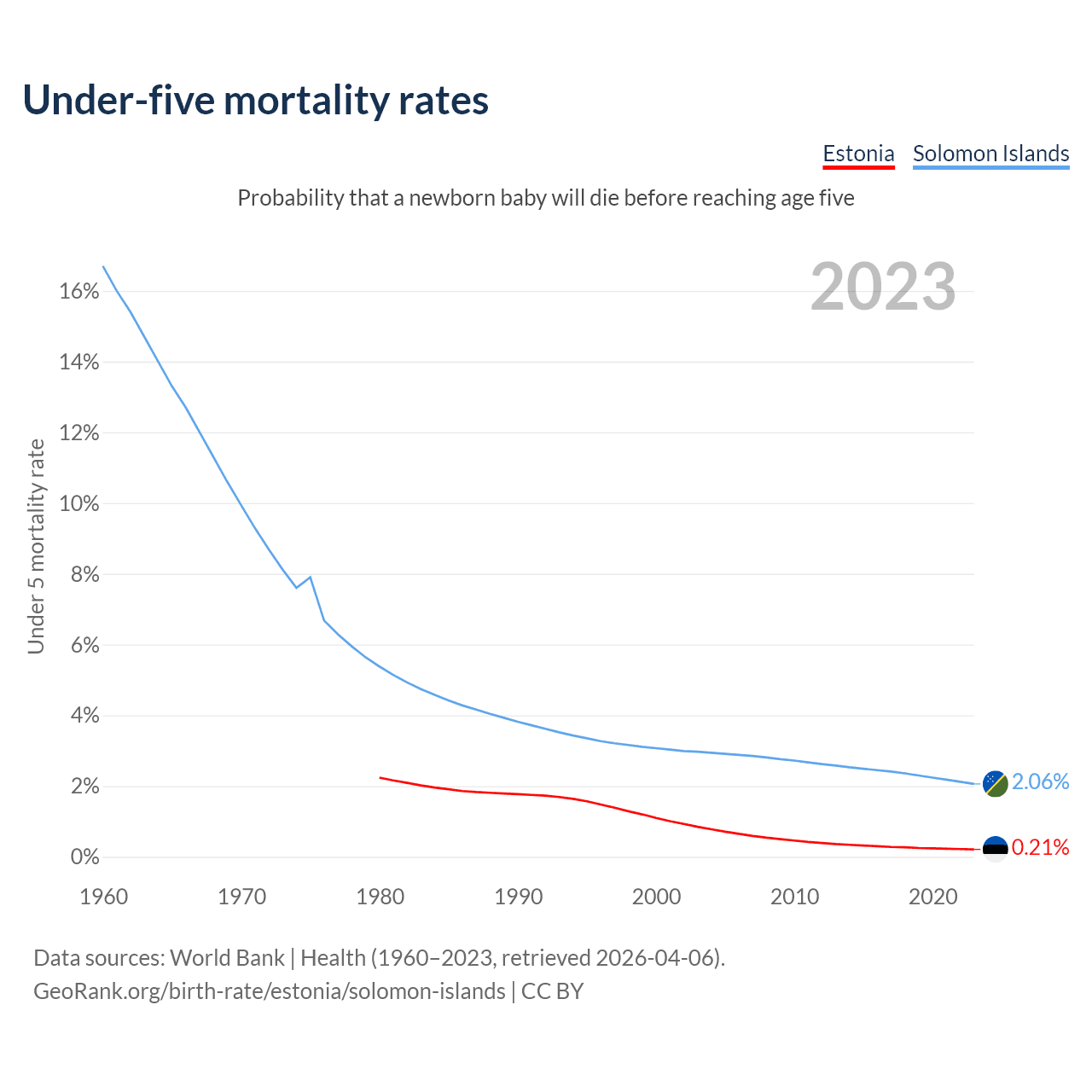 The chance that a newborn baby will die before reaching age five is 0.21% in Estonia and 2.06% in the Solomon Islands. Above is a chart with historical data on under-five mortality rates.