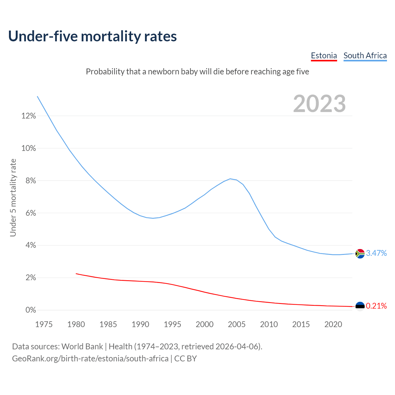 The chance that a newborn baby will die before reaching age five is 0.21% in Estonia and 3.47% in South Africa. Above is a chart with historical data on under-five mortality rates.