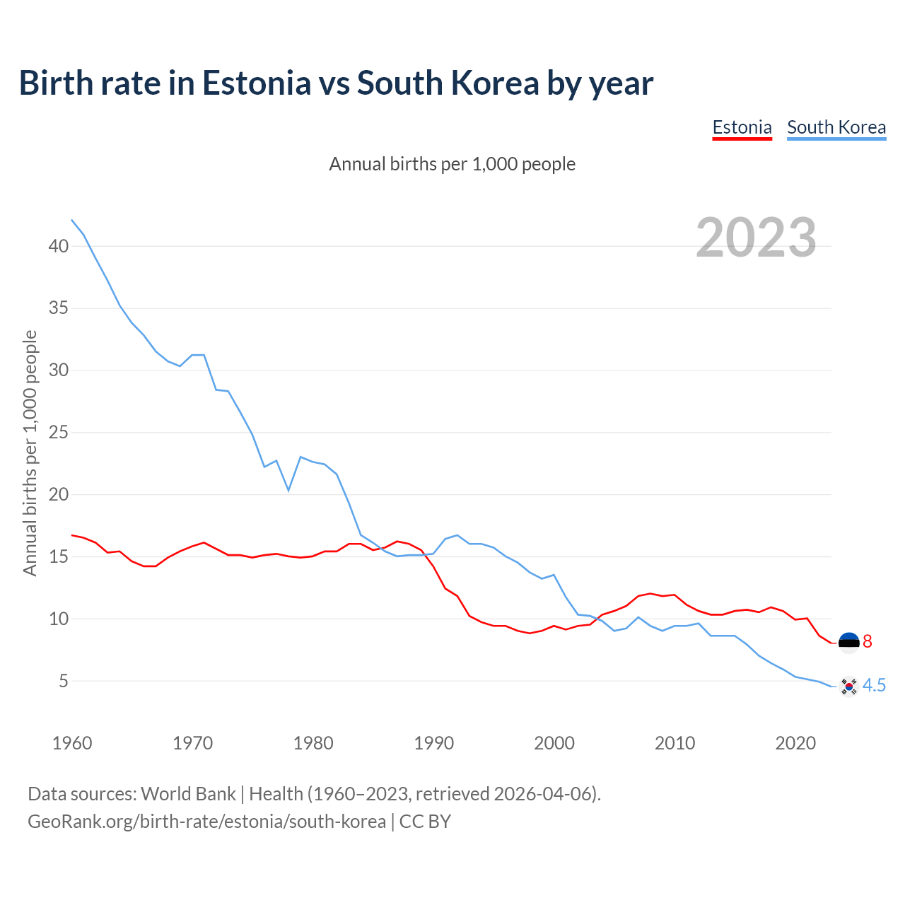 Estonia has an annual birth rate of 8 births per 1,000 people, compared to 4.5 for South Korea. The average number of children a woman is expected to have during her lifetime — the fertility rate, is 1.31 in Estonia and 0.72 in South Korea — 45% difference.