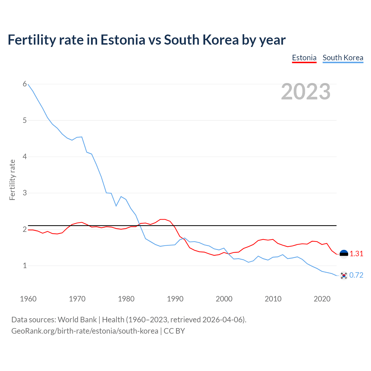 According to the latest available data on birth rates, the fertility rate in Estonia was 1.31 children per woman in 2023, compared to 0.72 in South Korea in 2023. The replacement level is considered to be 2.1 children per woman.