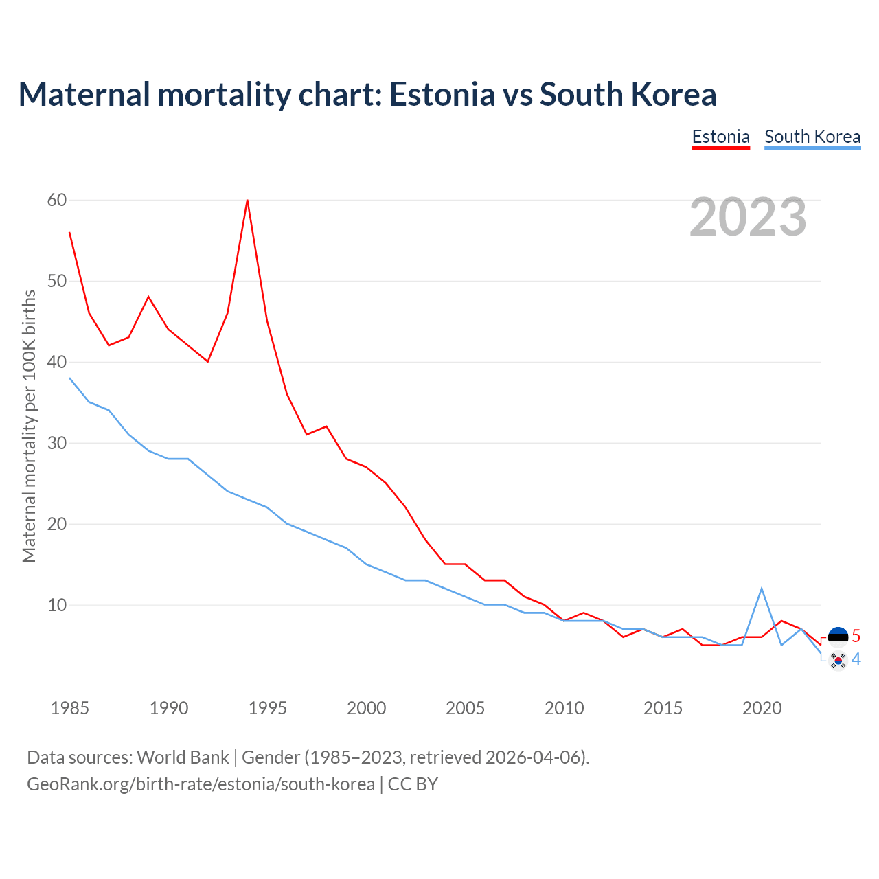 The maternal mortality rate, which is the probability of dying during childbirth or within 42 days of pregnancy termination, is 5 deaths per 100,000 live births in Estonia, compared to 4 deaths in South Korea.