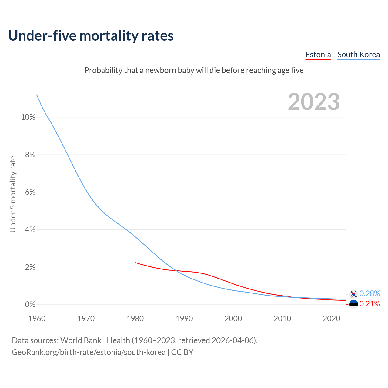 The chance that a newborn baby will die before reaching age five is 0.21% in Estonia and 0.28% in South Korea. Above is a chart with historical data on under-five mortality rates.
