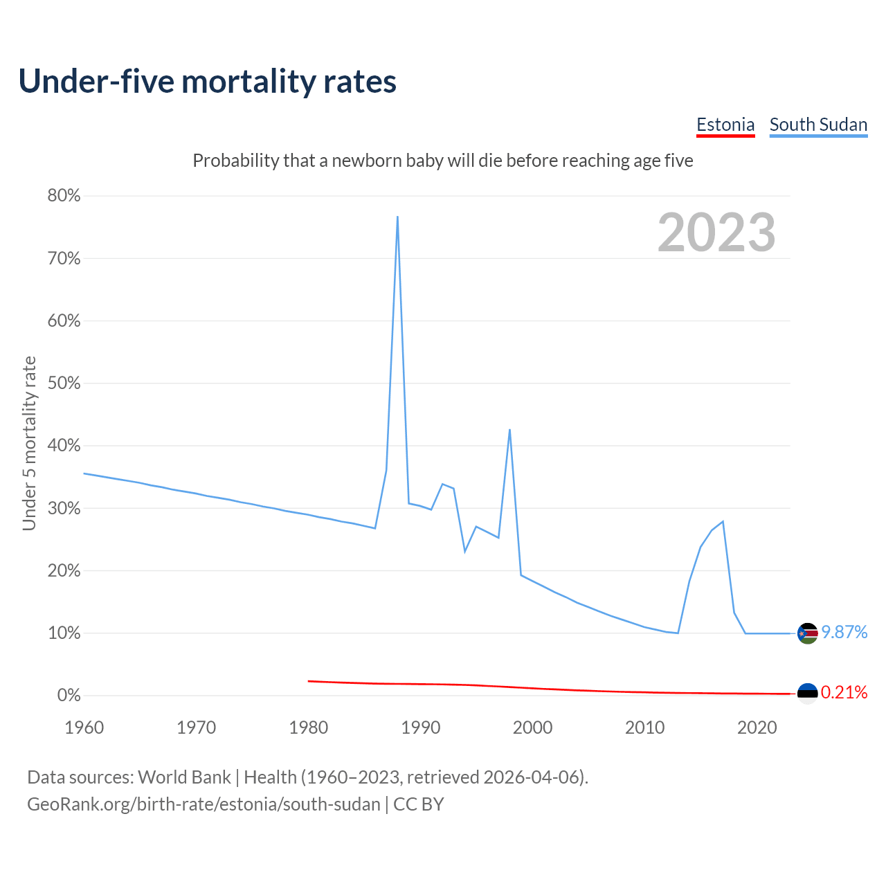 The chance that a newborn baby will die before reaching age five is 0.21% in Estonia and 9.87% in South Sudan. Above is a chart with historical data on under-five mortality rates.