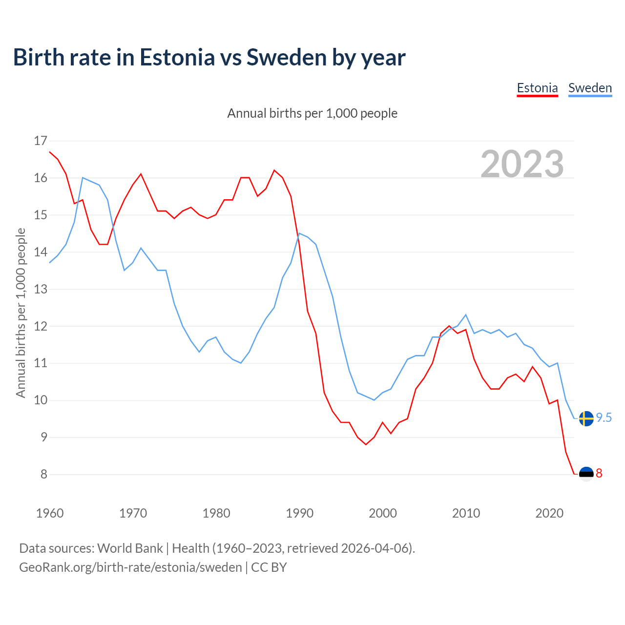 Estonia has an annual birth rate of 8 births per 1,000 people, compared to 9.5 for Sweden. The average number of children a woman is expected to have during her lifetime — the fertility rate, is 1.31 in Estonia and 1.45 in Sweden — 10.7% difference.