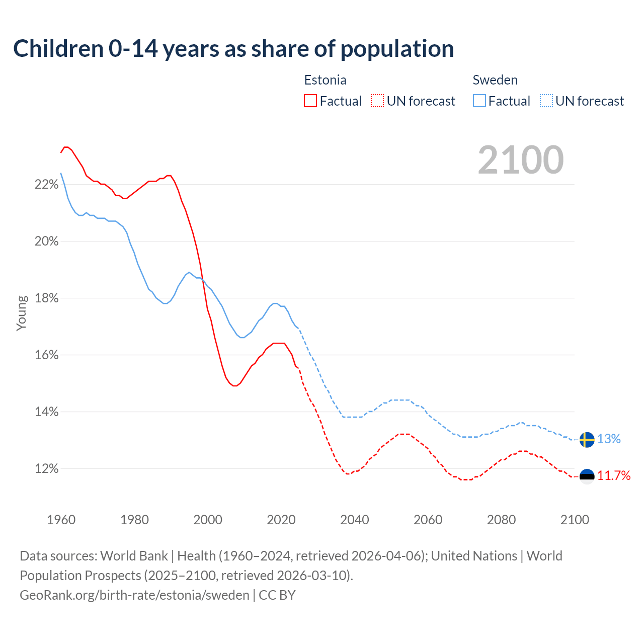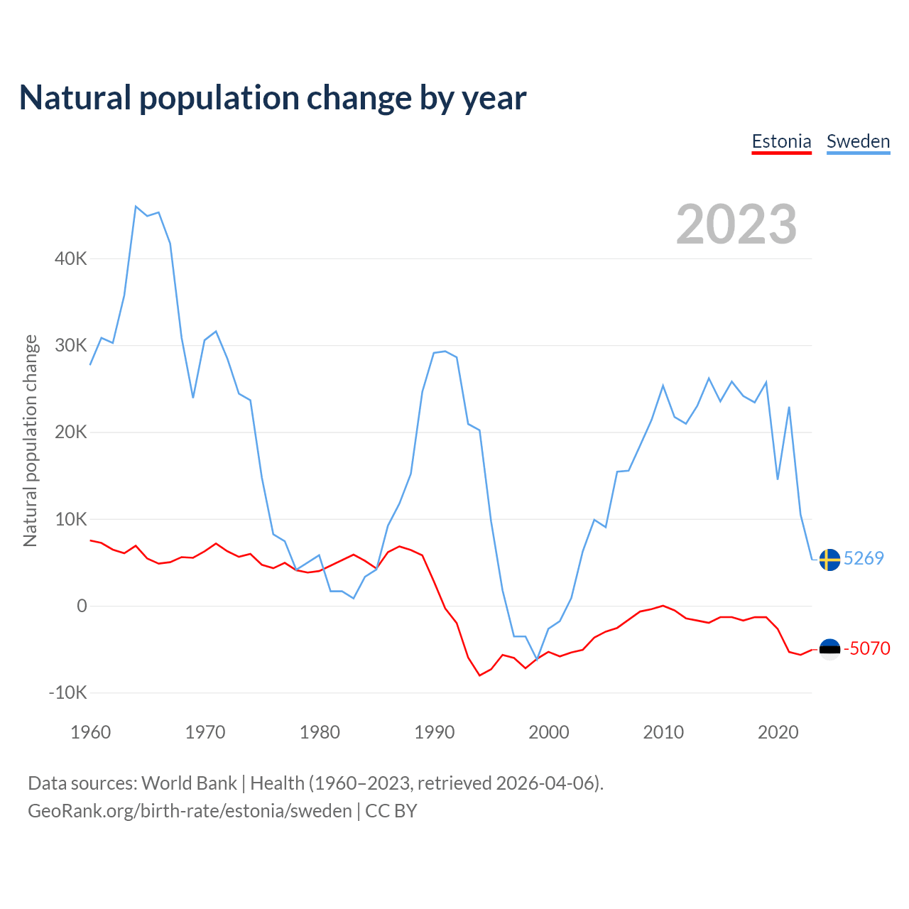 According to the latest available data on birth rates, the fertility rate in Estonia was 1.31 children per woman in 2023, compared to 1.45 in Sweden in 2023. The replacement level is considered to be 2.1 children per woman.
