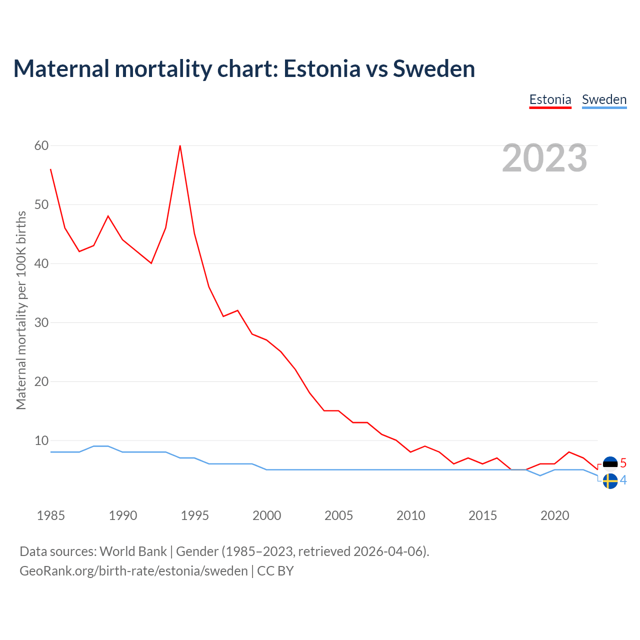 The maternal mortality rate, which is the probability of dying during childbirth or within 42 days of pregnancy termination, is 5 deaths per 100,000 live births in Estonia, compared to 4 deaths in Sweden.