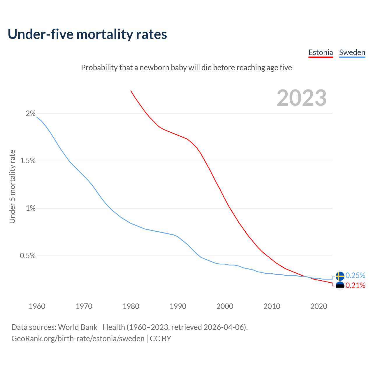 The chance that a newborn baby will die before reaching age five is 0.21% in Estonia and 0.25% in Sweden. Above is a chart with historical data on under-five mortality rates.