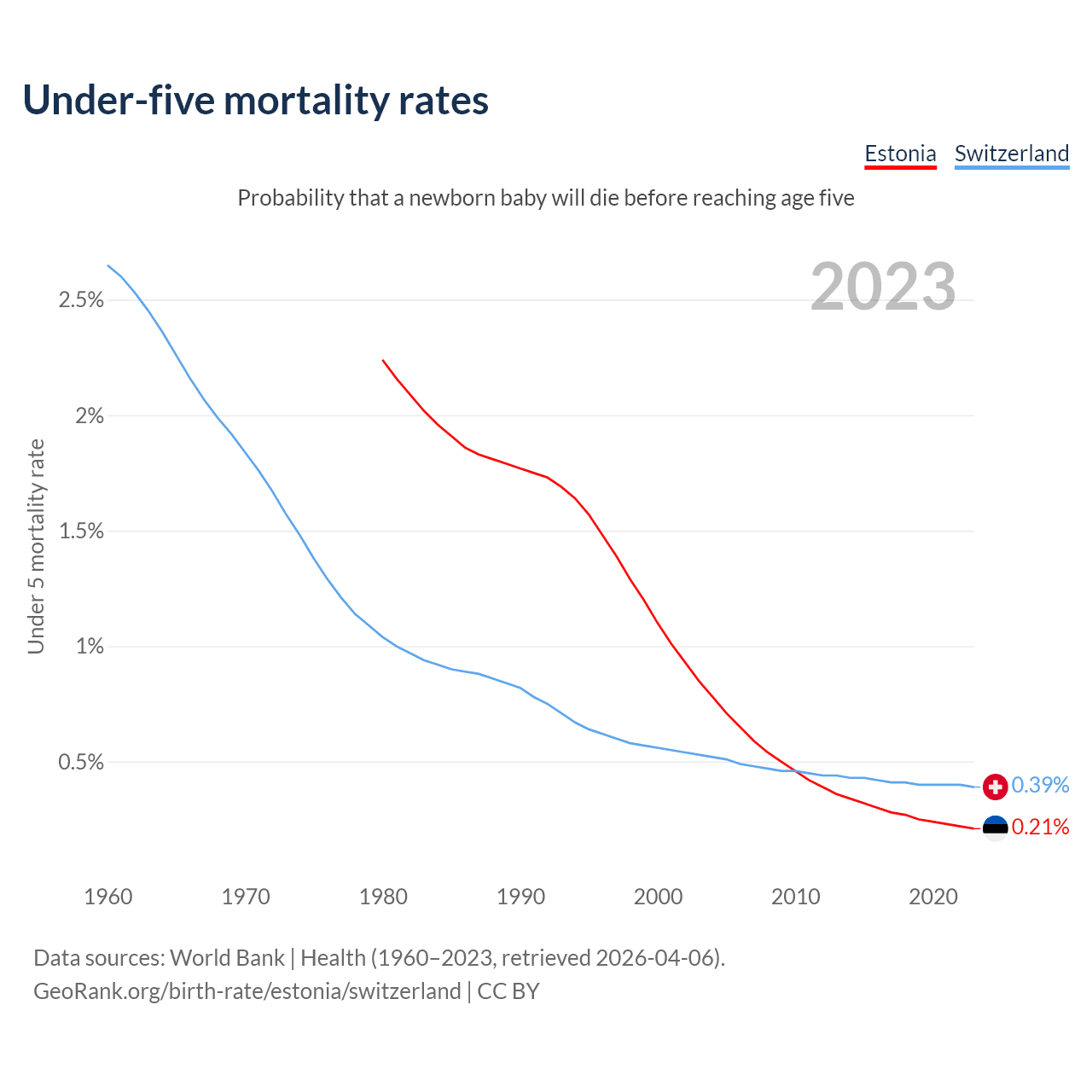 The chance that a newborn baby will die before reaching age five is 0.21% in Estonia and 0.39% in Switzerland. Above is a chart with historical data on under-five mortality rates.