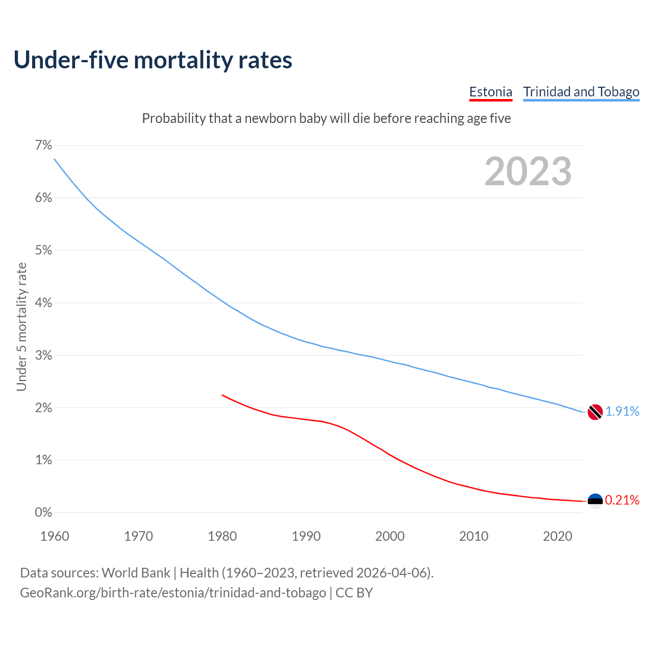 The chance that a newborn baby will die before reaching age five is 0.21% in Estonia and 1.91% in Trinidad and Tobago. Above is a chart with historical data on under-five mortality rates.