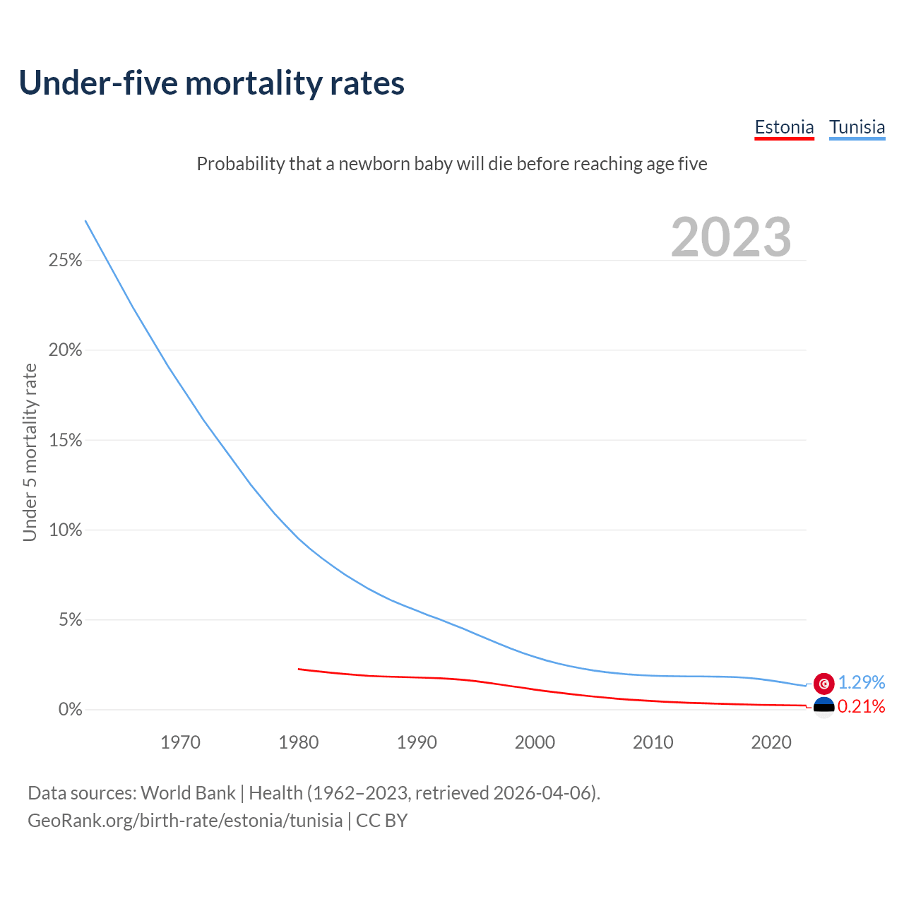 The chance that a newborn baby will die before reaching age five is 0.21% in Estonia and 1.29% in Tunisia. Above is a chart with historical data on under-five mortality rates.