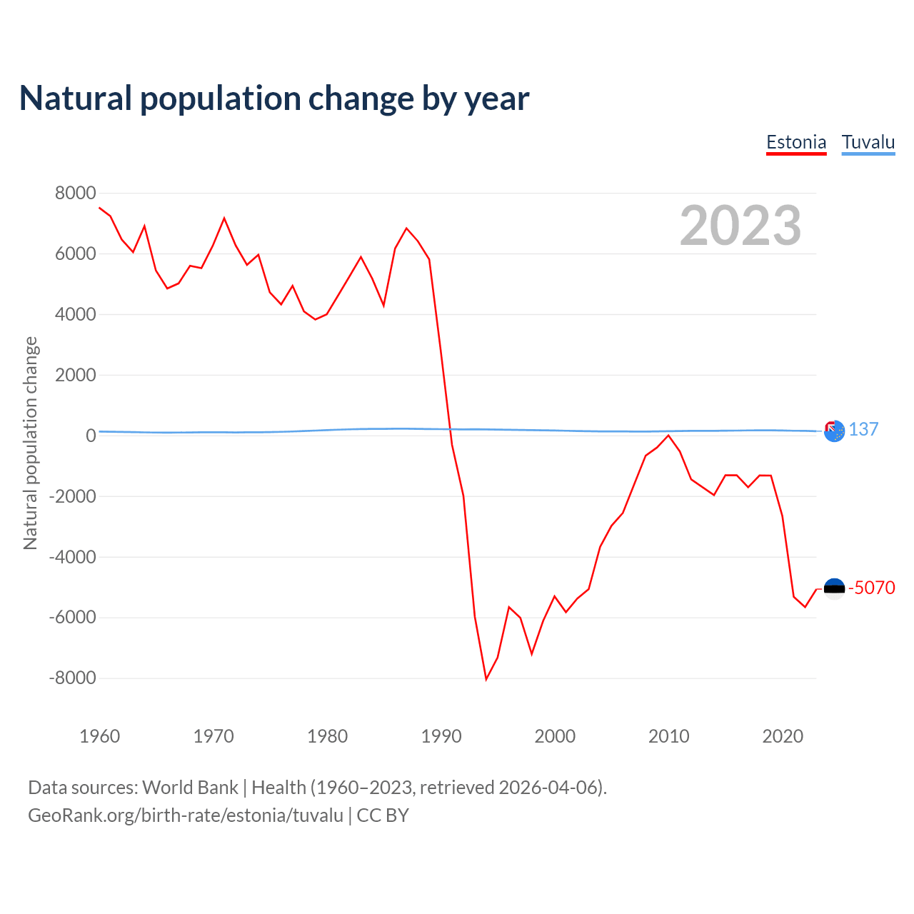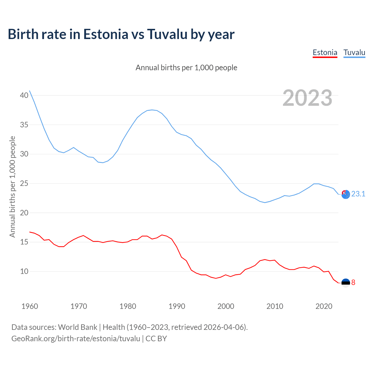 Estonia has an annual birth rate of 8 births per 1,000 people, compared to 23.1 for Tuvalu. The average number of children a woman is expected to have during her lifetime — the fertility rate, is 1.31 in Estonia and 3.21 in Tuvalu — 144.9% difference.