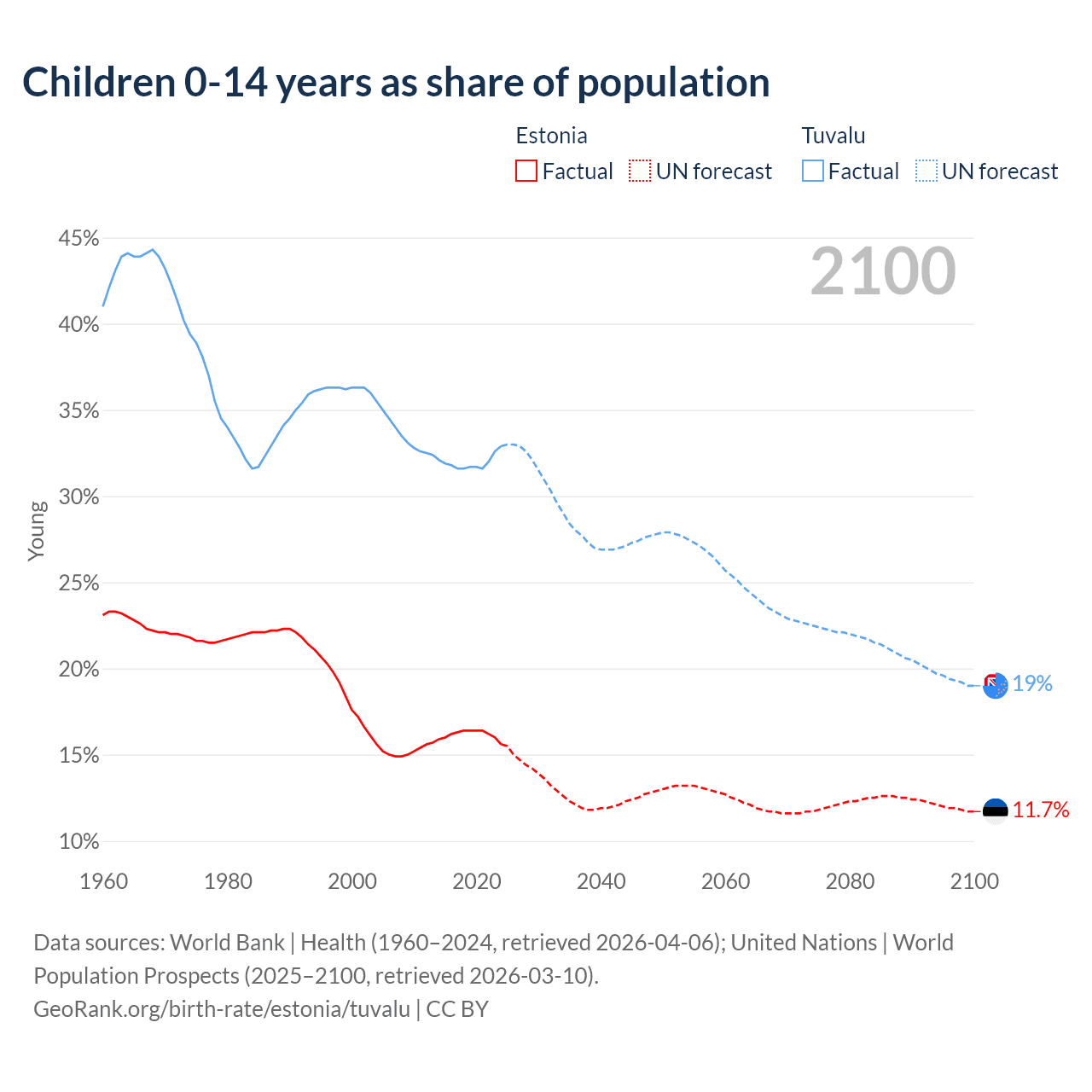 According to the latest available data on birth rates, the fertility rate in Estonia was 1.31 children per woman in 2023, compared to 3.21 in Tuvalu in 2023. The replacement level is considered to be 2.1 children per woman.