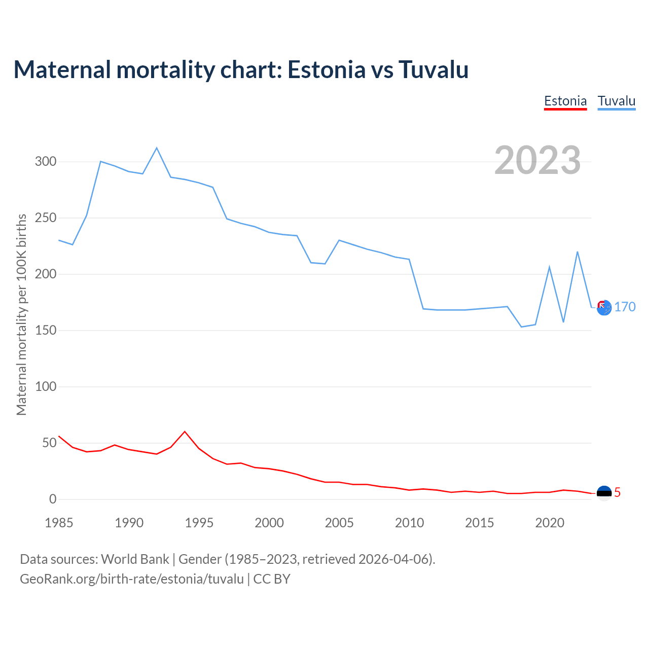 The maternal mortality rate, which is the probability of dying during childbirth or within 42 days of pregnancy termination, is 5 deaths per 100,000 live births in Estonia, compared to 170 deaths in Tuvalu.