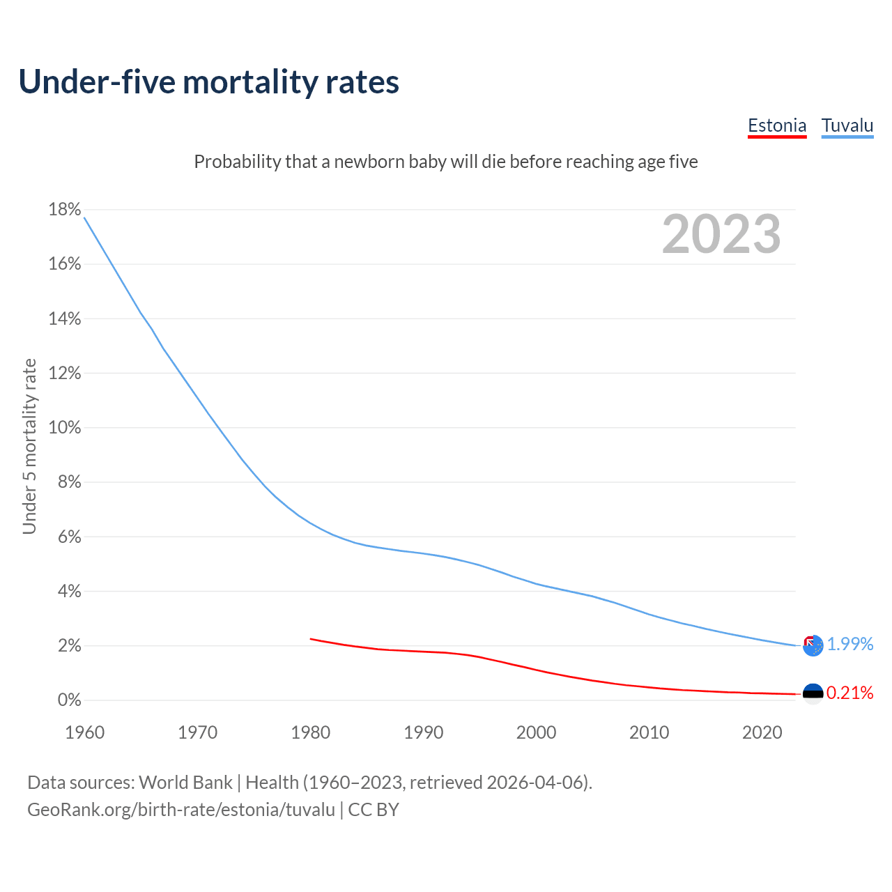 The chance that a newborn baby will die before reaching age five is 0.21% in Estonia and 1.99% in Tuvalu. Above is a chart with historical data on under-five mortality rates.
