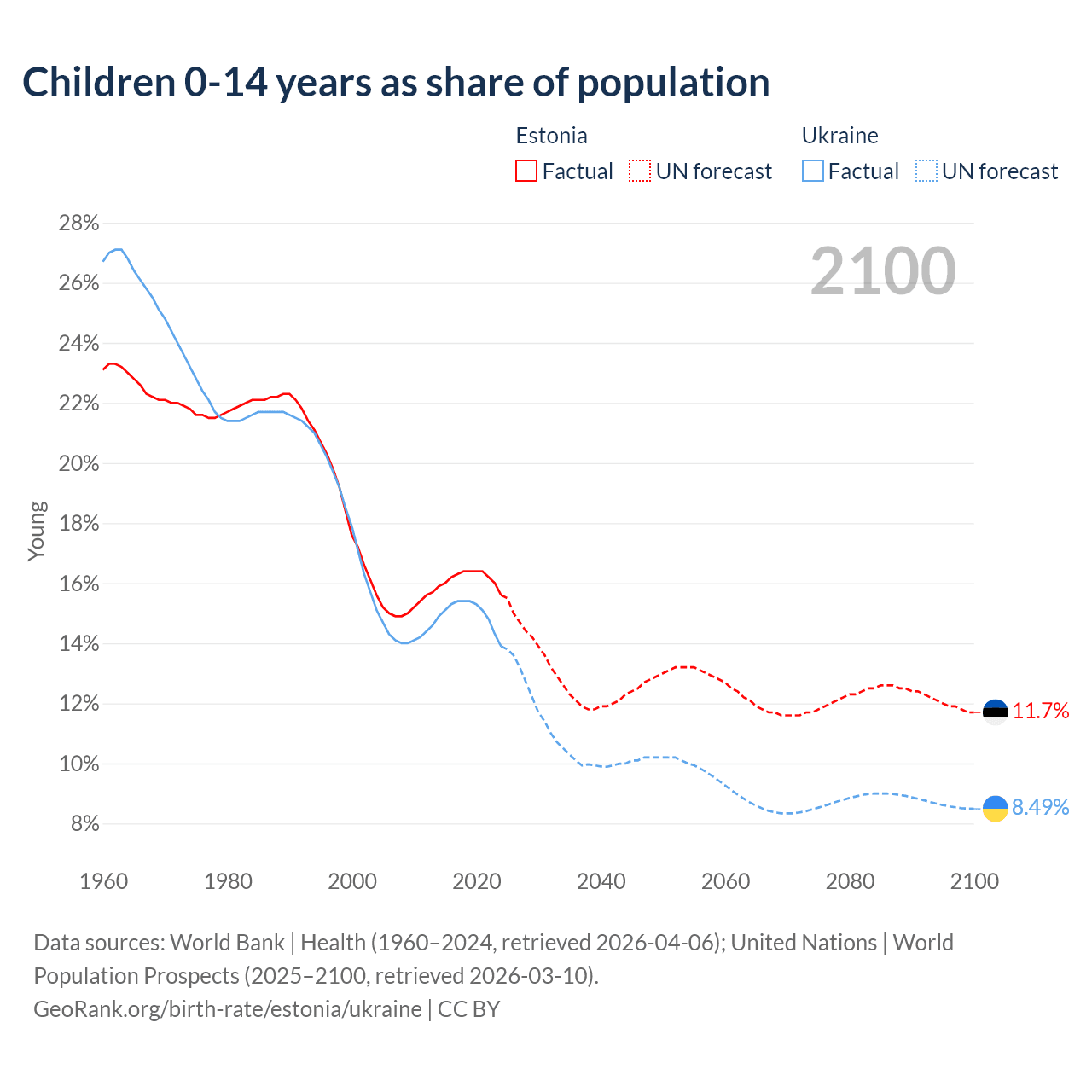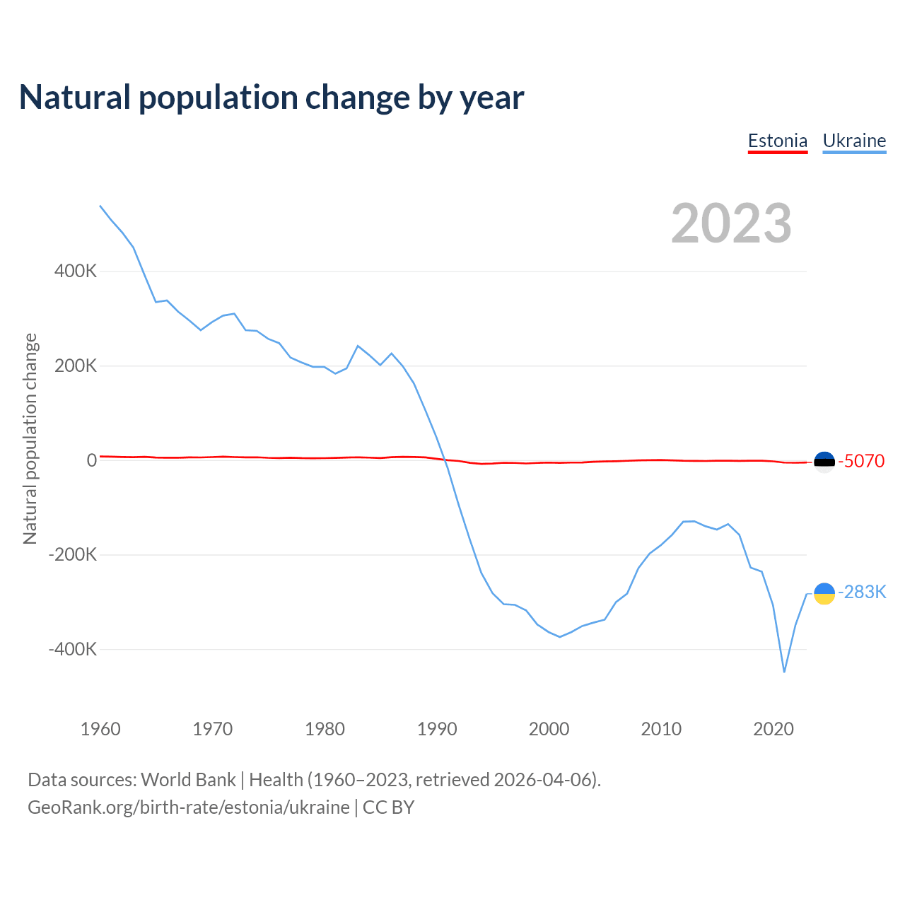 According to the latest available data on birth rates, the fertility rate in Estonia was 1.31 children per woman in 2023, compared to 0.98 in Ukraine in 2023. The replacement level is considered to be 2.1 children per woman.