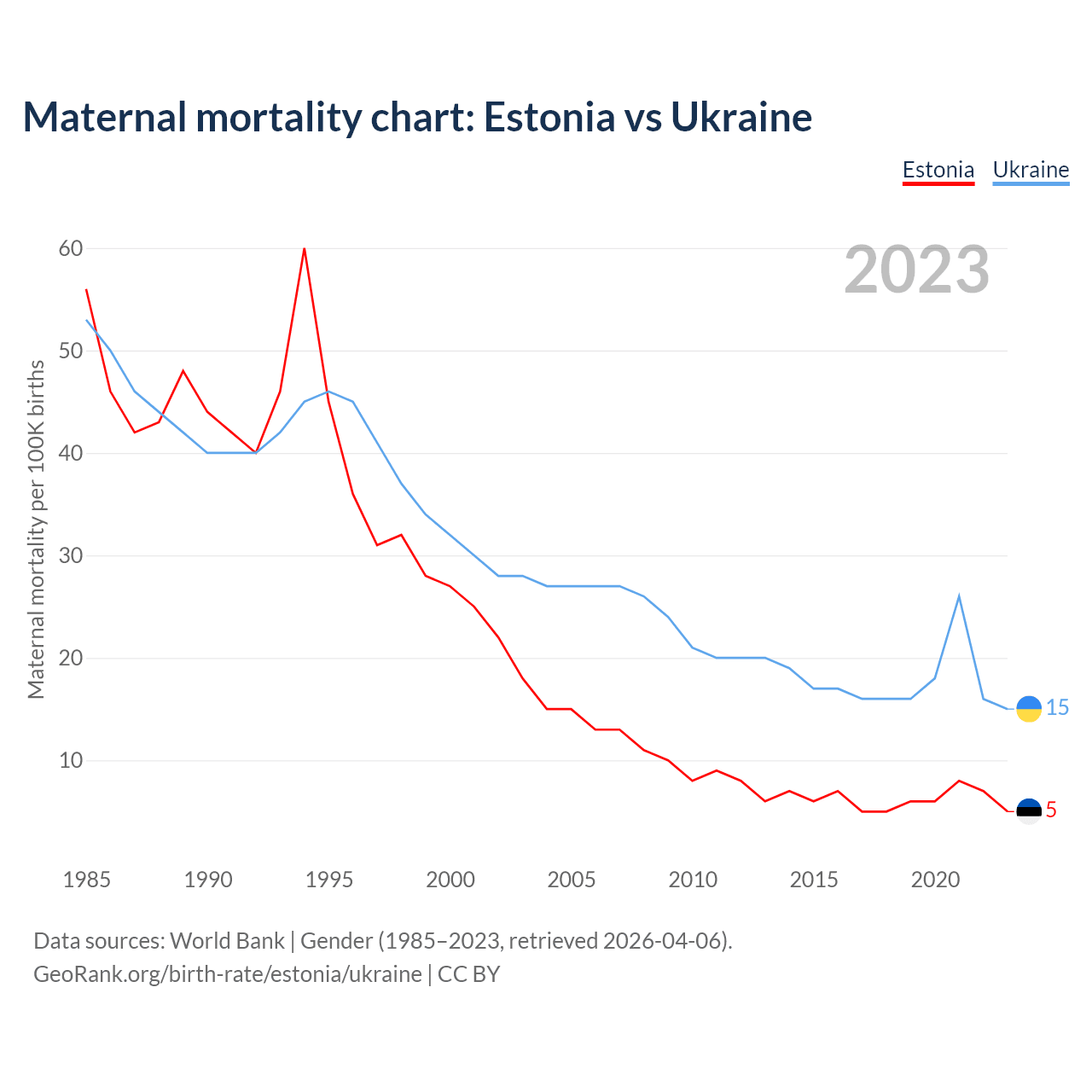 The maternal mortality rate, which is the probability of dying during childbirth or within 42 days of pregnancy termination, is 5 deaths per 100,000 live births in Estonia, compared to 15 deaths in Ukraine.