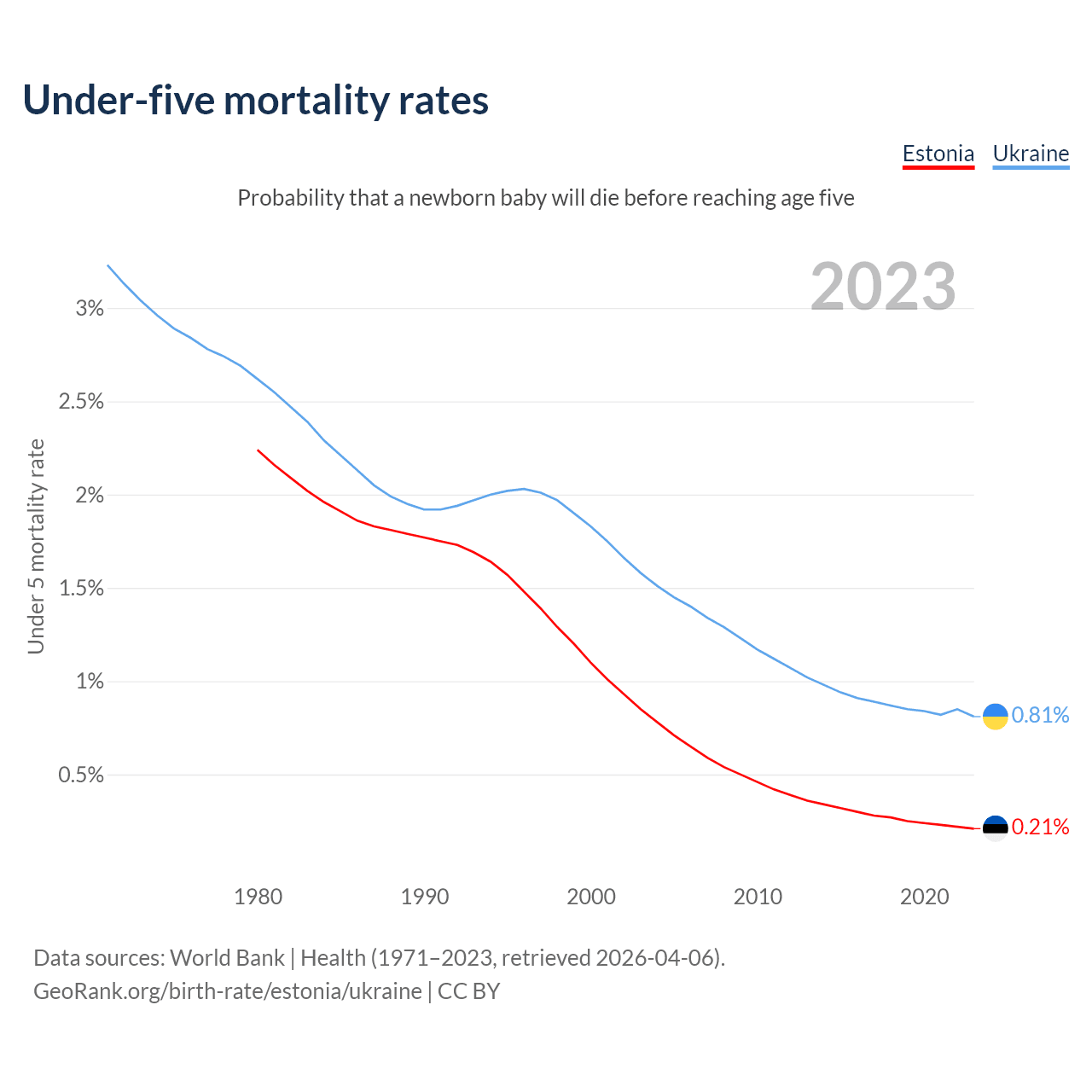 The chance that a newborn baby will die before reaching age five is 0.21% in Estonia and 0.81% in Ukraine. Above is a chart with historical data on under-five mortality rates.