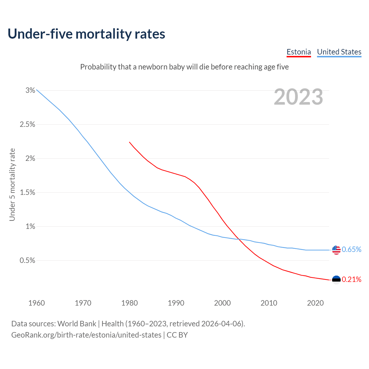The chance that a newborn baby will die before reaching age five is 0.21% in Estonia and 0.65% in the United States. Above is a chart with historical data on under-five mortality rates.