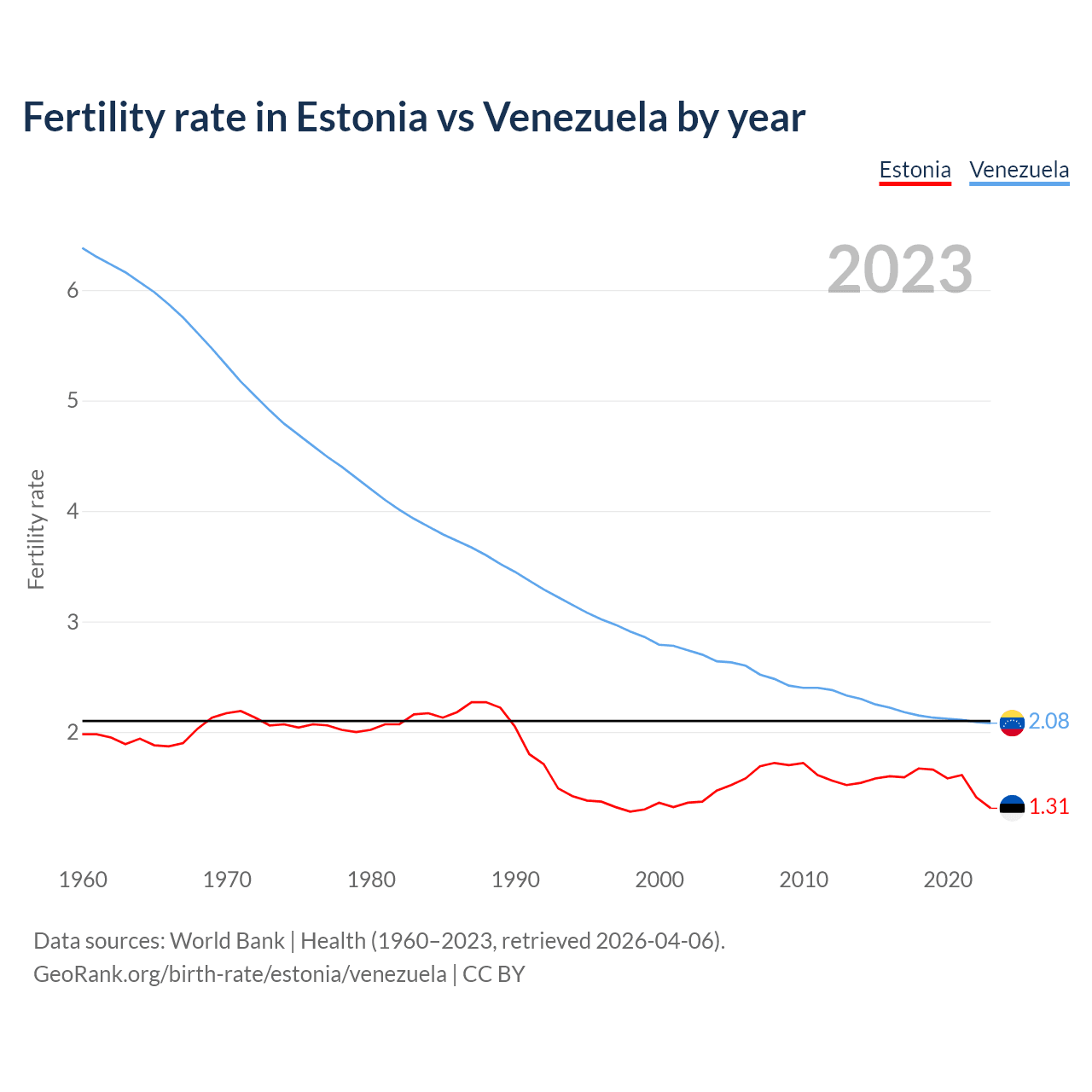 1960 vs 2023, the fertility rate has decreased by 33.8% in Estonia and by 67.4% in Venezuela — in 1960, it was 1.98 and 6.38, respectively.