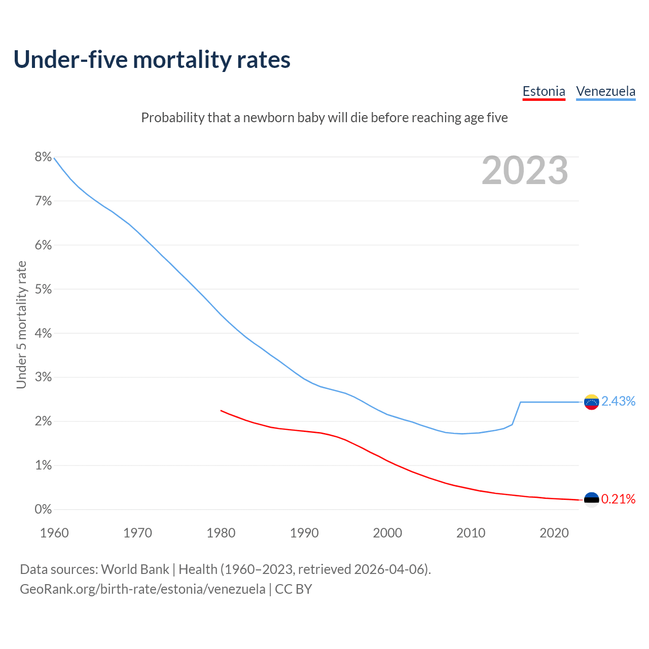 The chance that a newborn baby will die before reaching age five is 0.21% in Estonia and 2.43% in Venezuela. Above is a chart with historical data on under-five mortality rates.