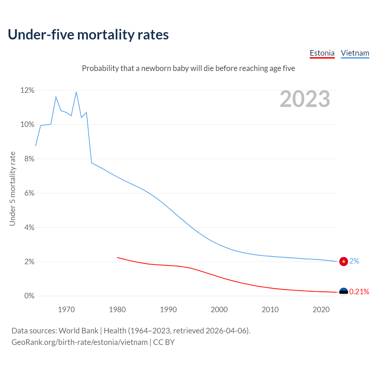 The chance that a newborn baby will die before reaching age five is 0.21% in Estonia and 2% in Vietnam. Above is a chart with historical data on under-five mortality rates.