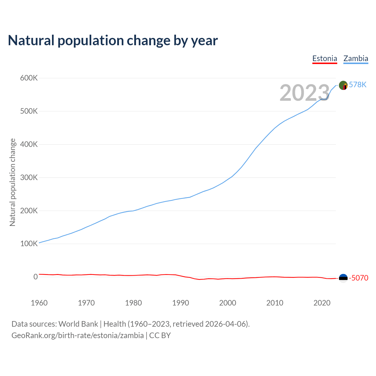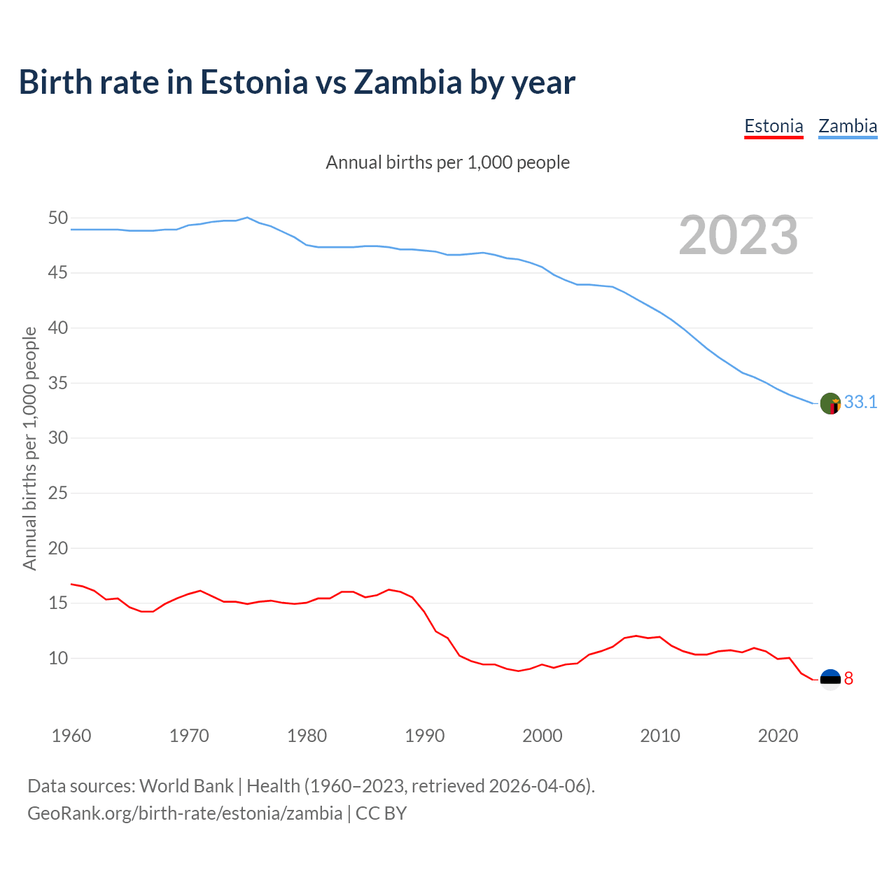 Estonia has an annual birth rate of 8 births per 1,000 people, compared to 33.1 for Zambia. The average number of children a woman is expected to have during her lifetime — the fertility rate, is 1.31 in Estonia and 4.1 in Zambia — 213.1% difference.