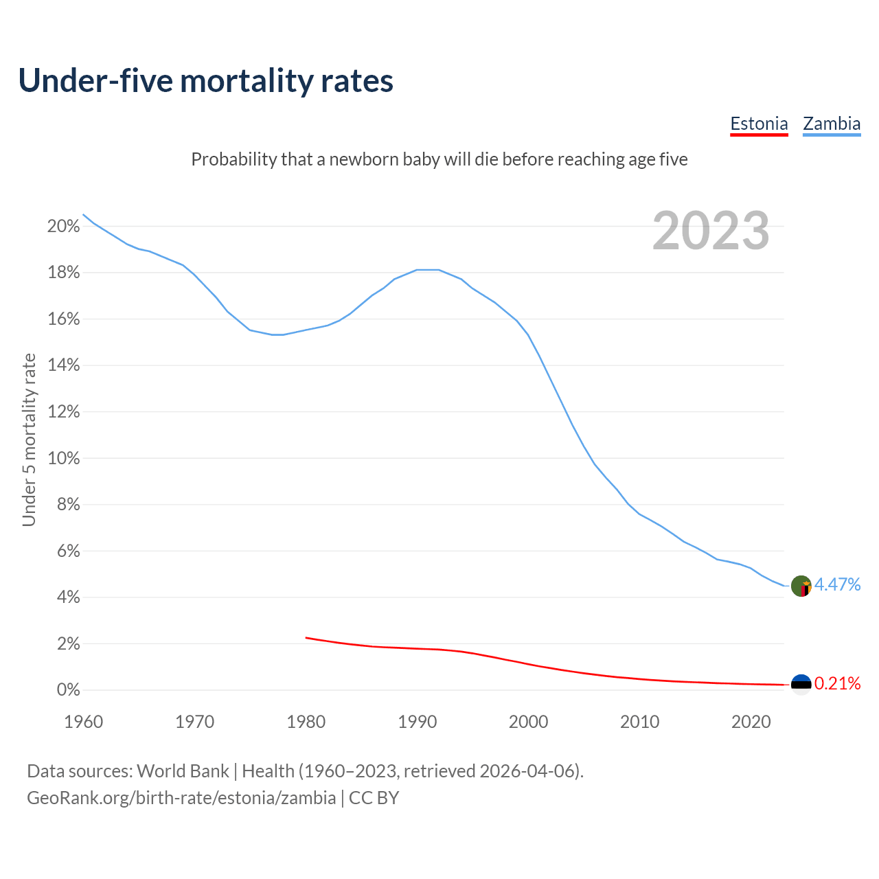 The chance that a newborn baby will die before reaching age five is 0.21% in Estonia and 4.47% in Zambia. Above is a chart with historical data on under-five mortality rates.