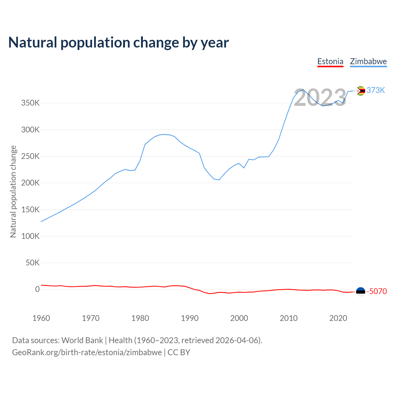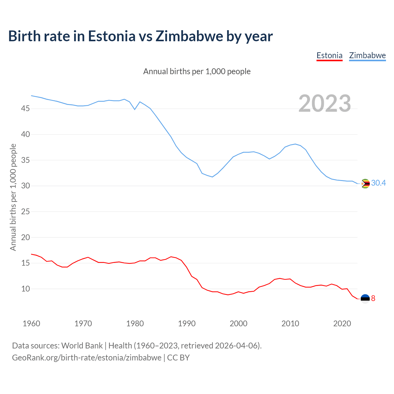 Estonia has an annual birth rate of 8 births per 1,000 people, compared to 30.4 for Zimbabwe. The average number of children a woman is expected to have during her lifetime — the fertility rate, is 1.31 in Estonia and 3.72 in Zimbabwe — 184.3% difference.