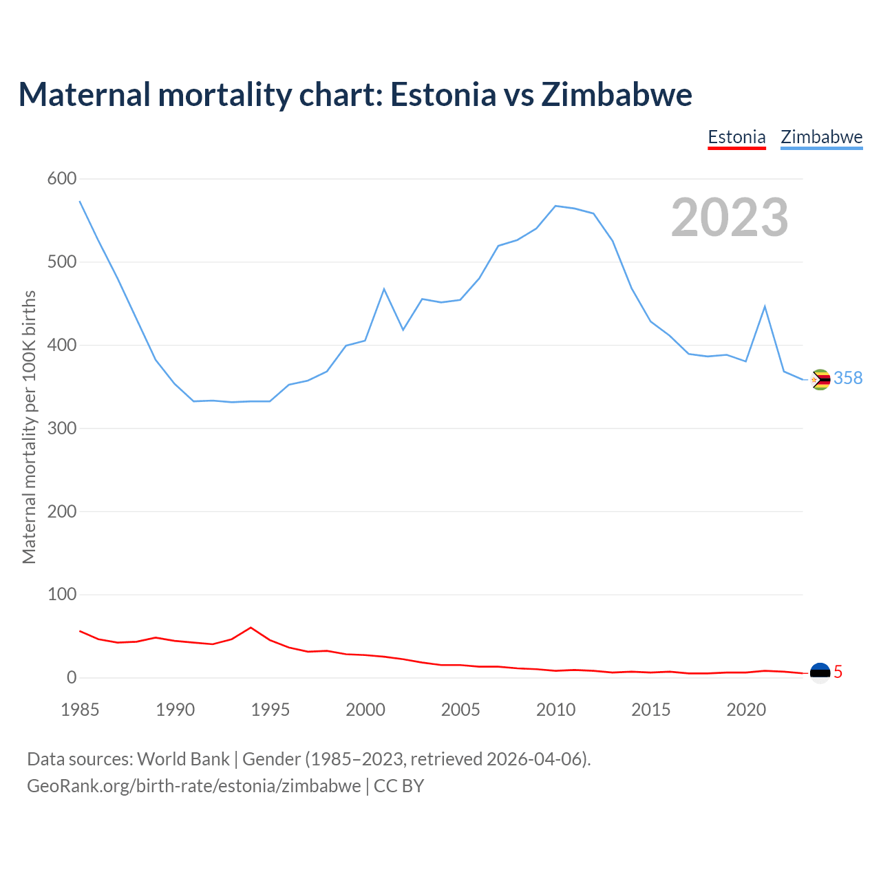 The maternal mortality rate, which is the probability of dying during childbirth or within 42 days of pregnancy termination, is 5 deaths per 100,000 live births in Estonia, compared to 358 deaths in Zimbabwe.