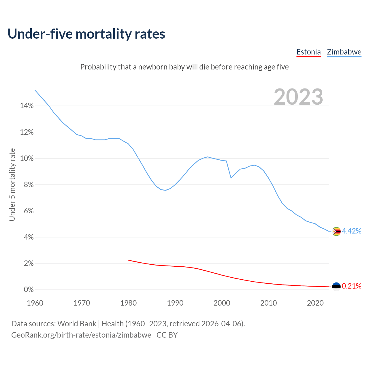 The chance that a newborn baby will die before reaching age five is 0.21% in Estonia and 4.42% in Zimbabwe. Above is a chart with historical data on under-five mortality rates.