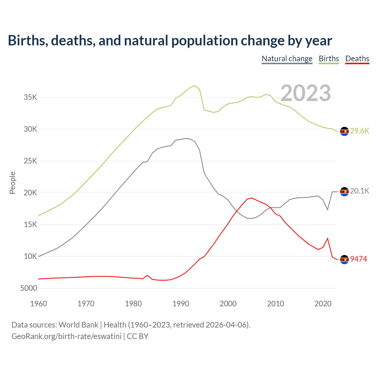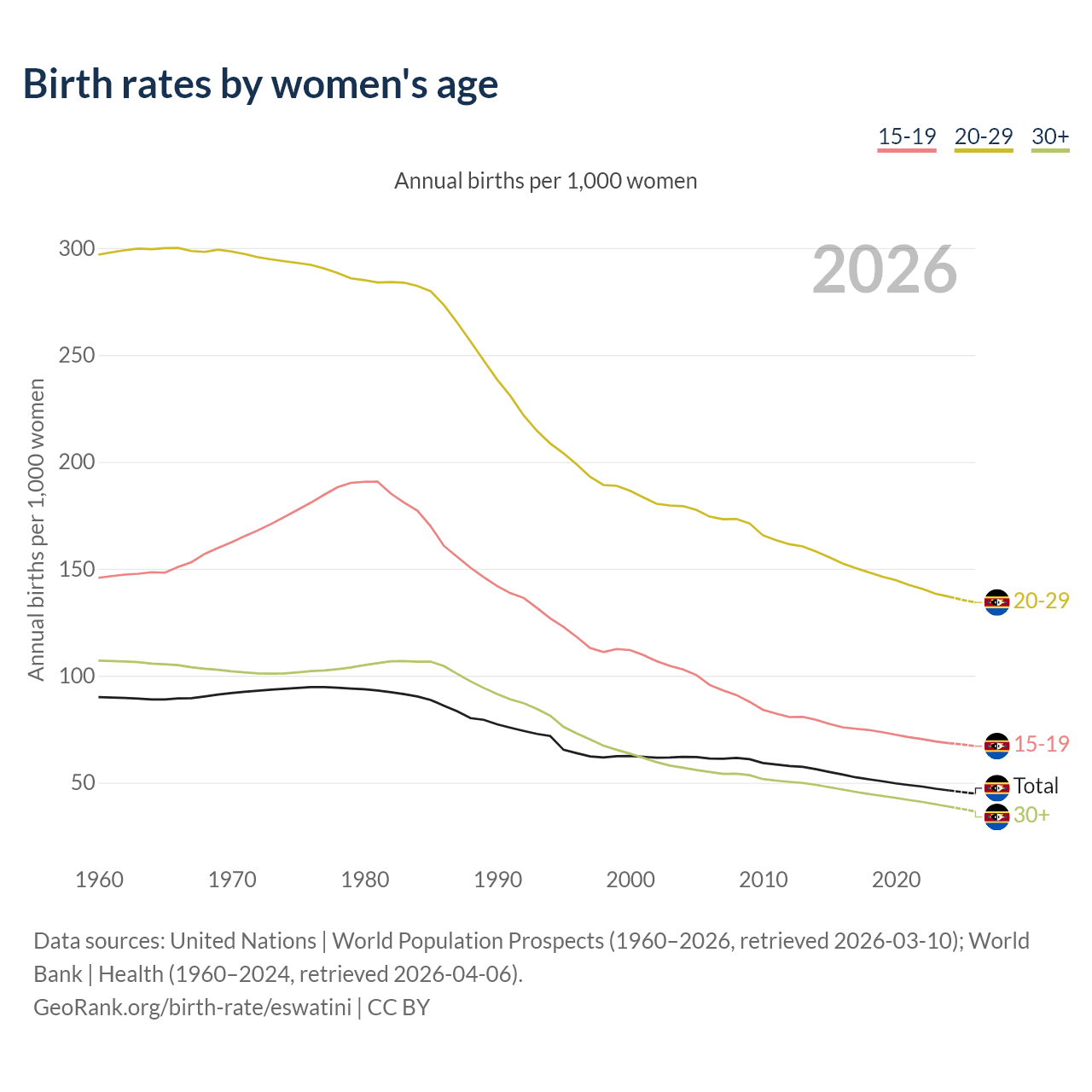 Eswatini has a birth rate of 24.1 (annual births per 1,000 people) and a fertility rate of 2.75 (the average number of children a woman is expected to have over her lifetime based on current age-specific birth rates).