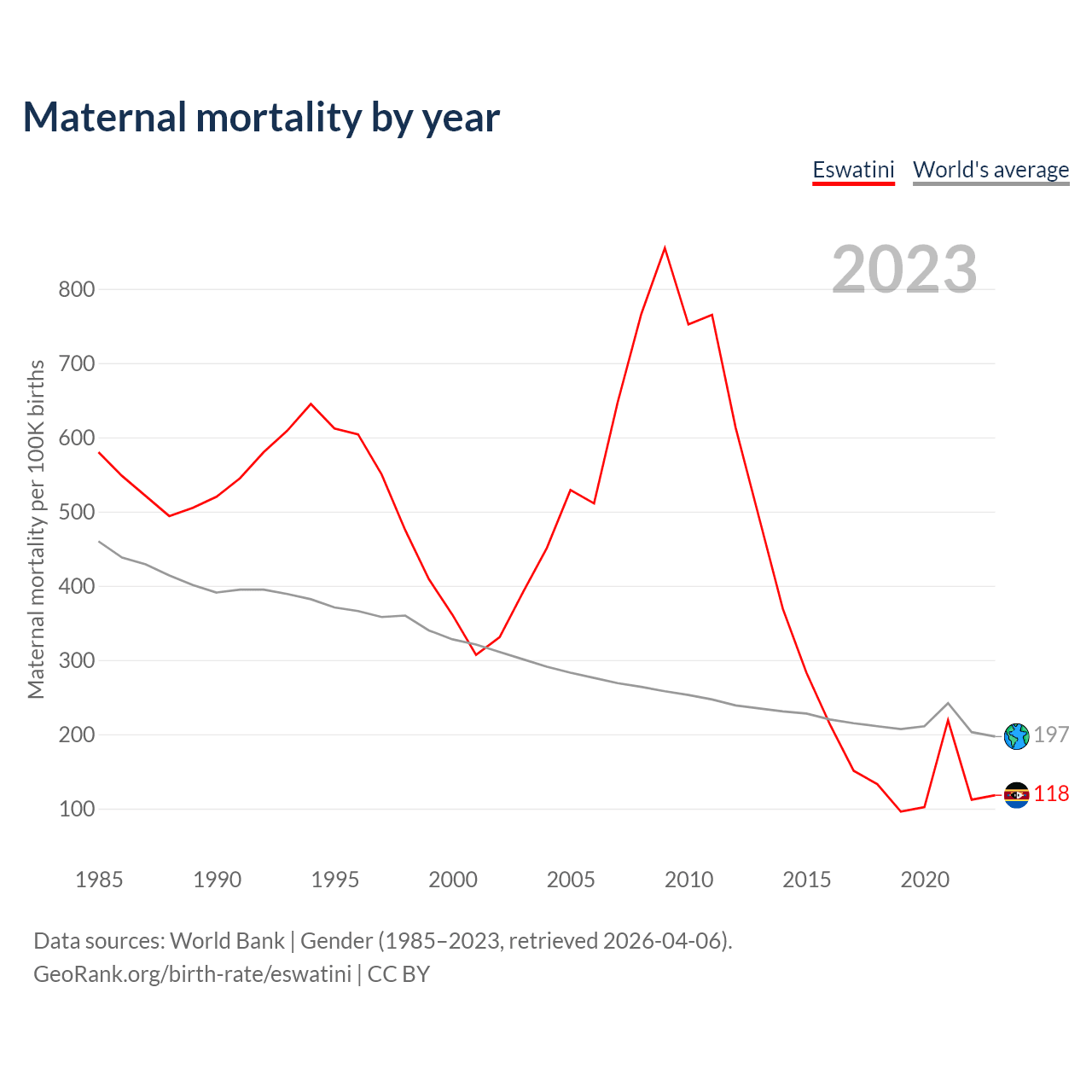 The maternal mortality rate in Eswatini was 118 deaths per 100,000 live births in 2023 — a 0.12% chance of dying during childbirth or within 42 days of pregnancy termination. This is a 67.3% decrease compared to the year 2000.