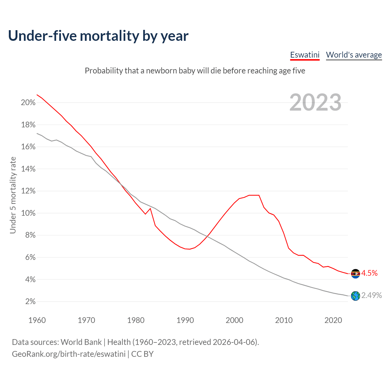 The under-5 mortality rate in Eswatini was 45 deaths per 1,000 live births in 2023 — a 4.5% chance that a newborn baby will die before reaching age five. This is down from 109.1 deaths per 1,000 live births in 2000.