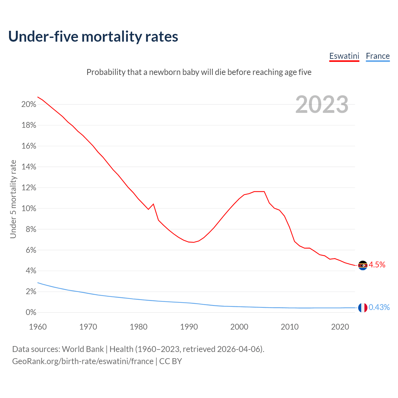 The chance that a newborn baby will die before reaching age five is 4.5% in Eswatini and 0.43% in France. Above is a chart with historical data on under-five mortality rates.