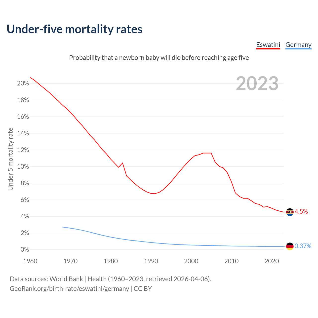 The chance that a newborn baby will die before reaching age five is 4.5% in Eswatini and 0.37% in Germany. Above is a chart with historical data on under-five mortality rates.