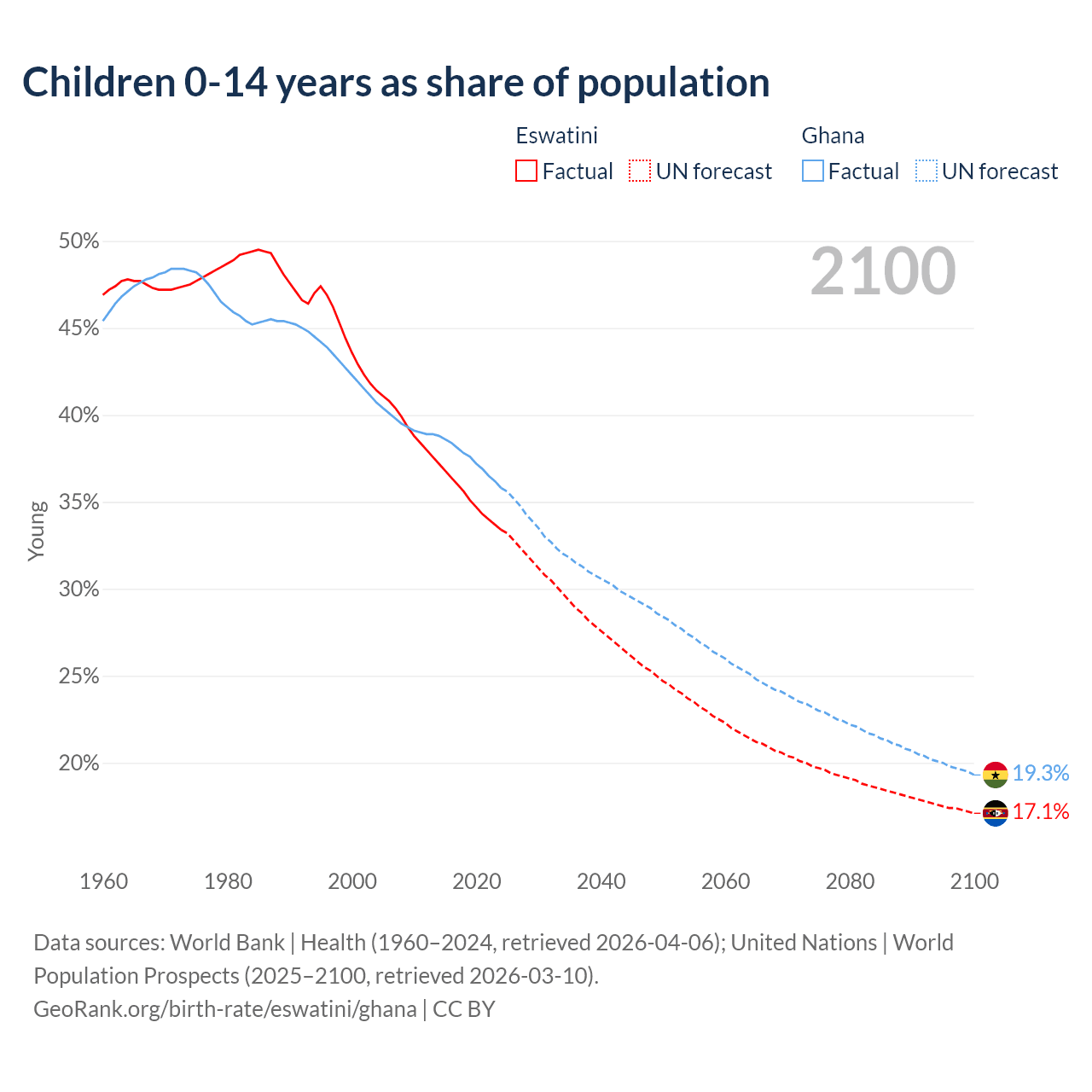 According to the latest available data on birth rates, the fertility rate in Eswatini was 2.75 children per woman in 2023, compared to 3.4 in Ghana in 2023. The replacement level is considered to be 2.1 children per woman.