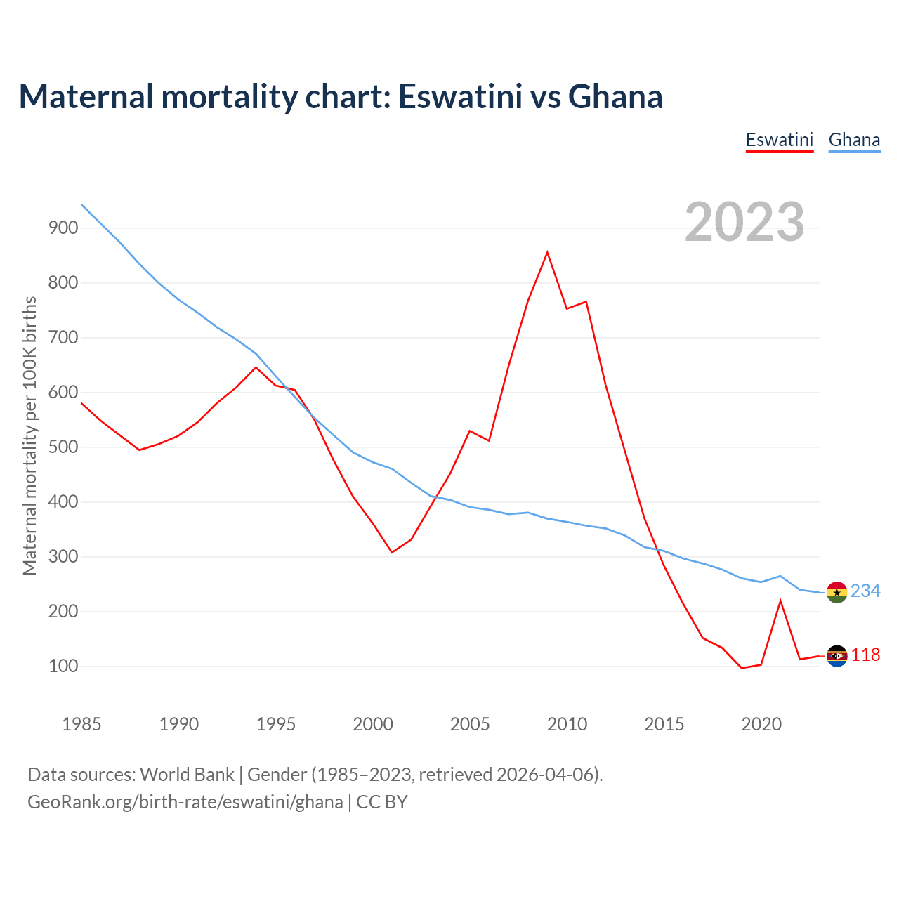The maternal mortality rate, which is the probability of dying during childbirth or within 42 days of pregnancy termination, is 118 deaths per 100,000 live births in Eswatini, compared to 234 deaths in Ghana.