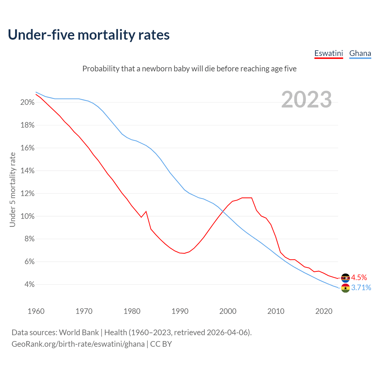 The chance that a newborn baby will die before reaching age five is 4.5% in Eswatini and 3.71% in Ghana. Above is a chart with historical data on under-five mortality rates.