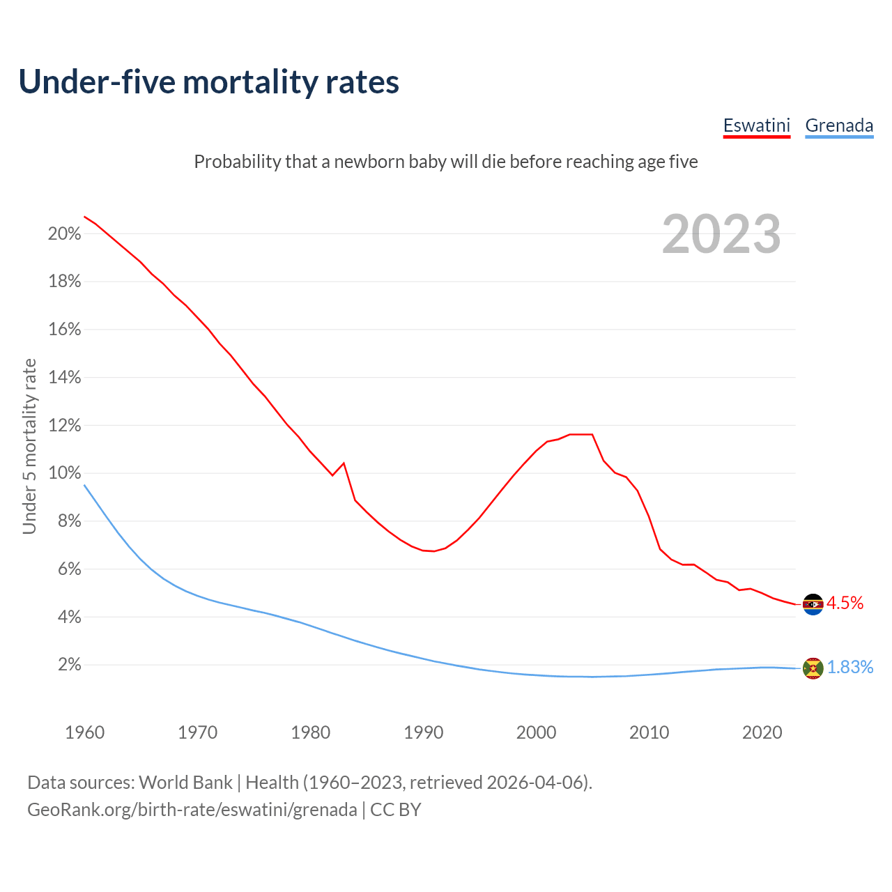 The chance that a newborn baby will die before reaching age five is 4.5% in Eswatini and 1.83% in Grenada. Above is a chart with historical data on under-five mortality rates.