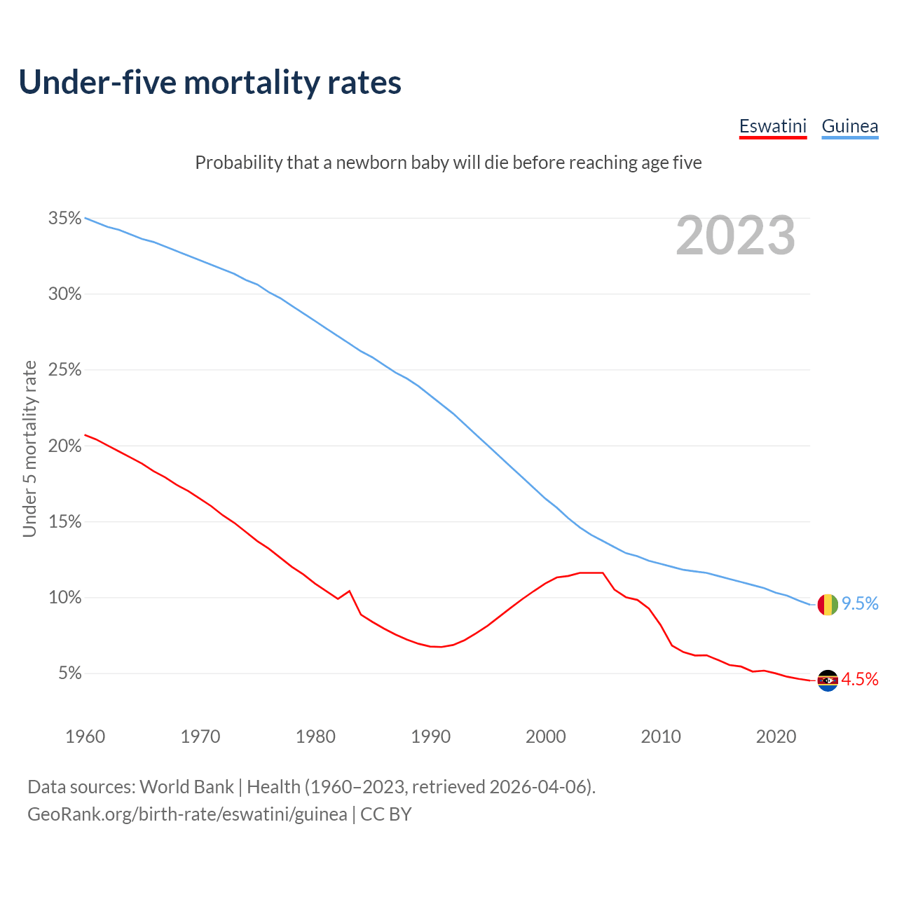 The chance that a newborn baby will die before reaching age five is 4.5% in Eswatini and 9.5% in Guinea. Above is a chart with historical data on under-five mortality rates.