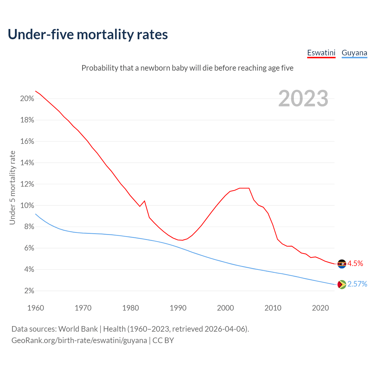 The chance that a newborn baby will die before reaching age five is 4.5% in Eswatini and 2.57% in Guyana. Above is a chart with historical data on under-five mortality rates.