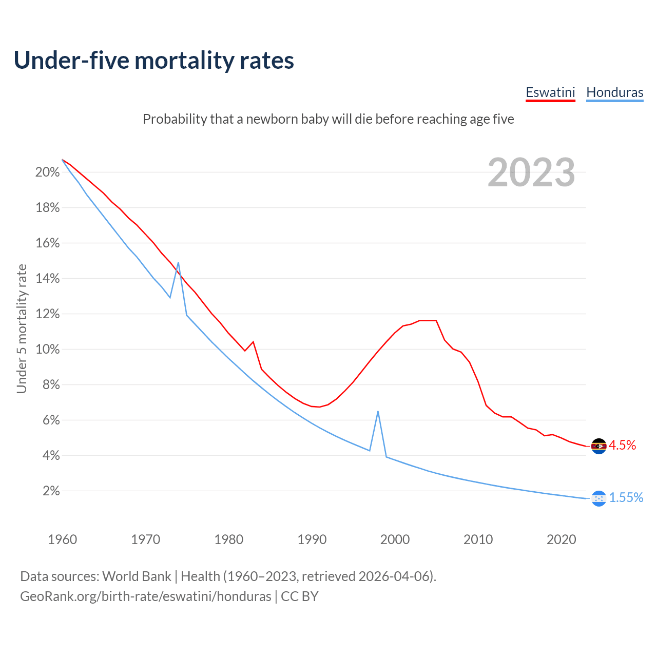 The chance that a newborn baby will die before reaching age five is 4.5% in Eswatini and 1.55% in Honduras. Above is a chart with historical data on under-five mortality rates.