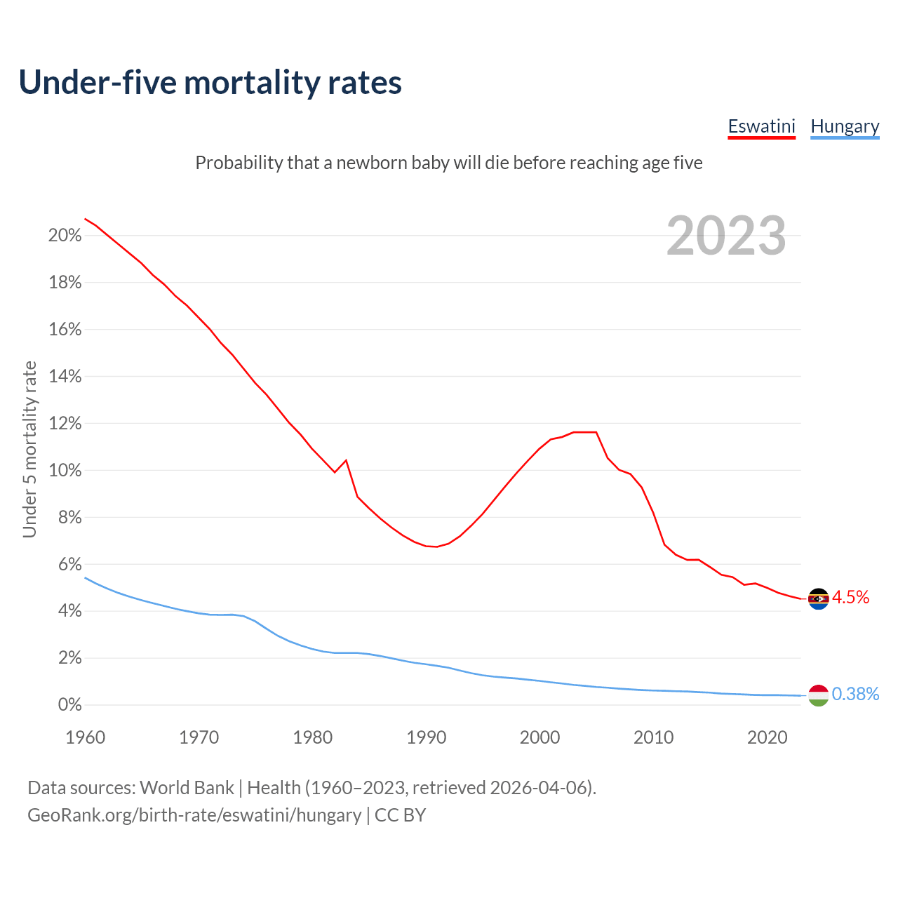 The chance that a newborn baby will die before reaching age five is 4.5% in Eswatini and 0.38% in Hungary. Above is a chart with historical data on under-five mortality rates.