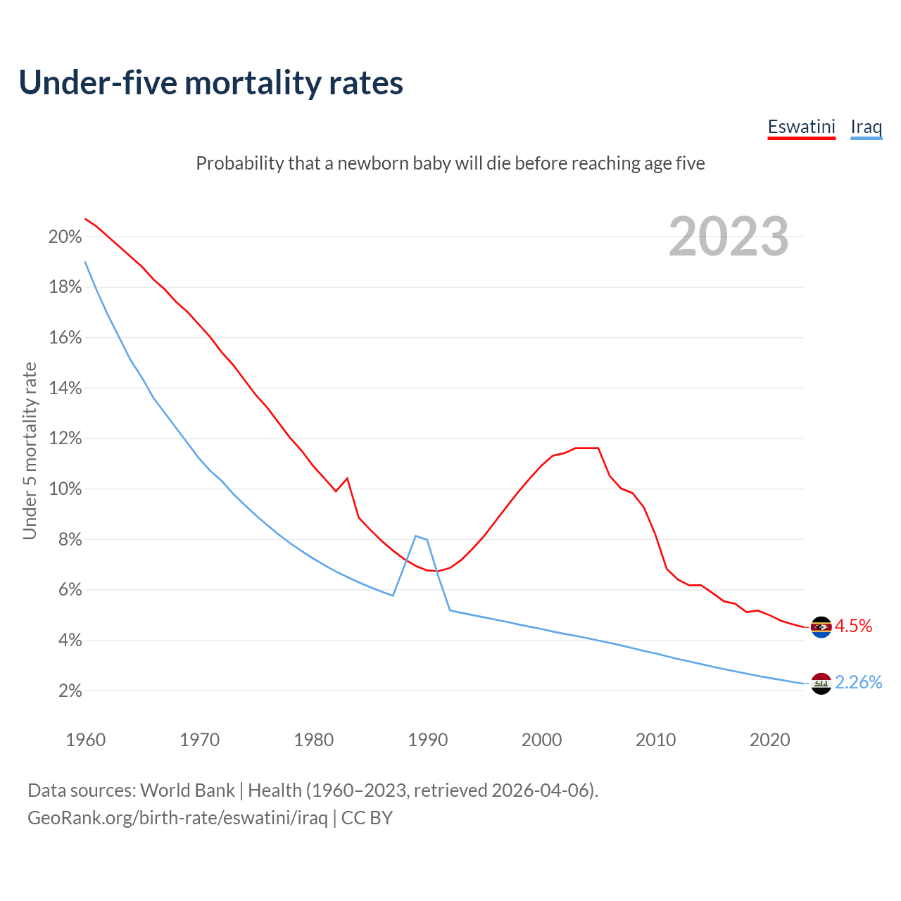 The chance that a newborn baby will die before reaching age five is 4.5% in Eswatini and 2.26% in Iraq. Above is a chart with historical data on under-five mortality rates.