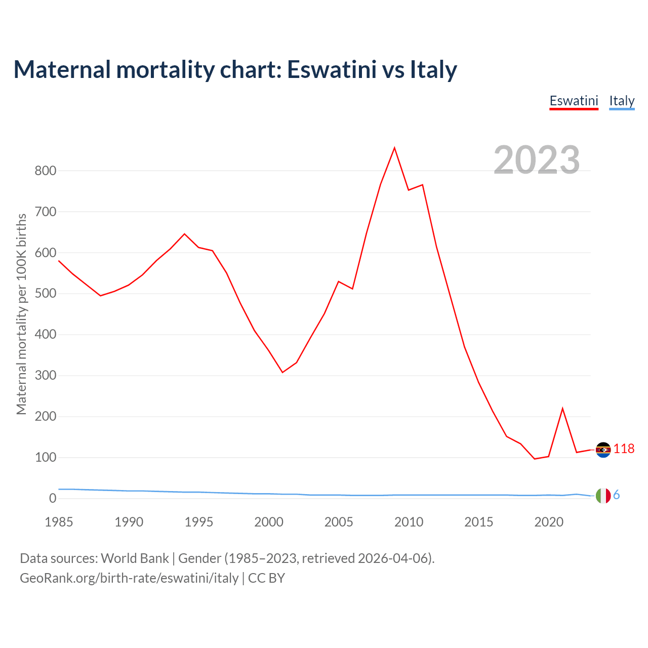 The maternal mortality rate, which is the probability of dying during childbirth or within 42 days of pregnancy termination, is 118 deaths per 100,000 live births in Eswatini, compared to 6 deaths in Italy.