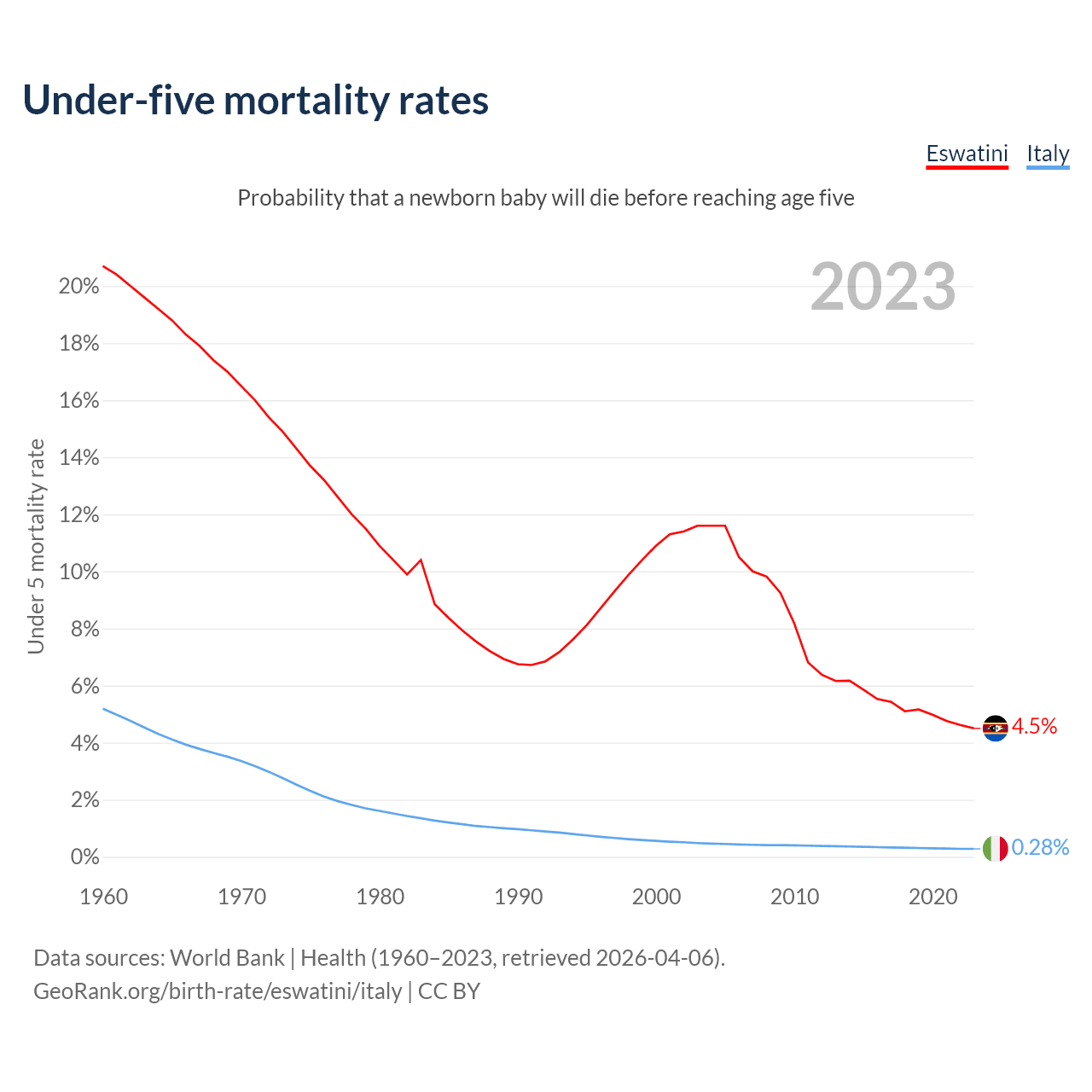 The chance that a newborn baby will die before reaching age five is 4.5% in Eswatini and 0.28% in Italy. Above is a chart with historical data on under-five mortality rates.