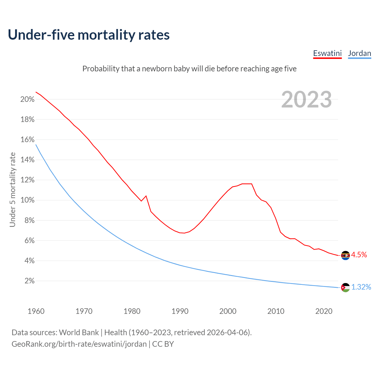 The chance that a newborn baby will die before reaching age five is 4.5% in Eswatini and 1.32% in Jordan. Above is a chart with historical data on under-five mortality rates.